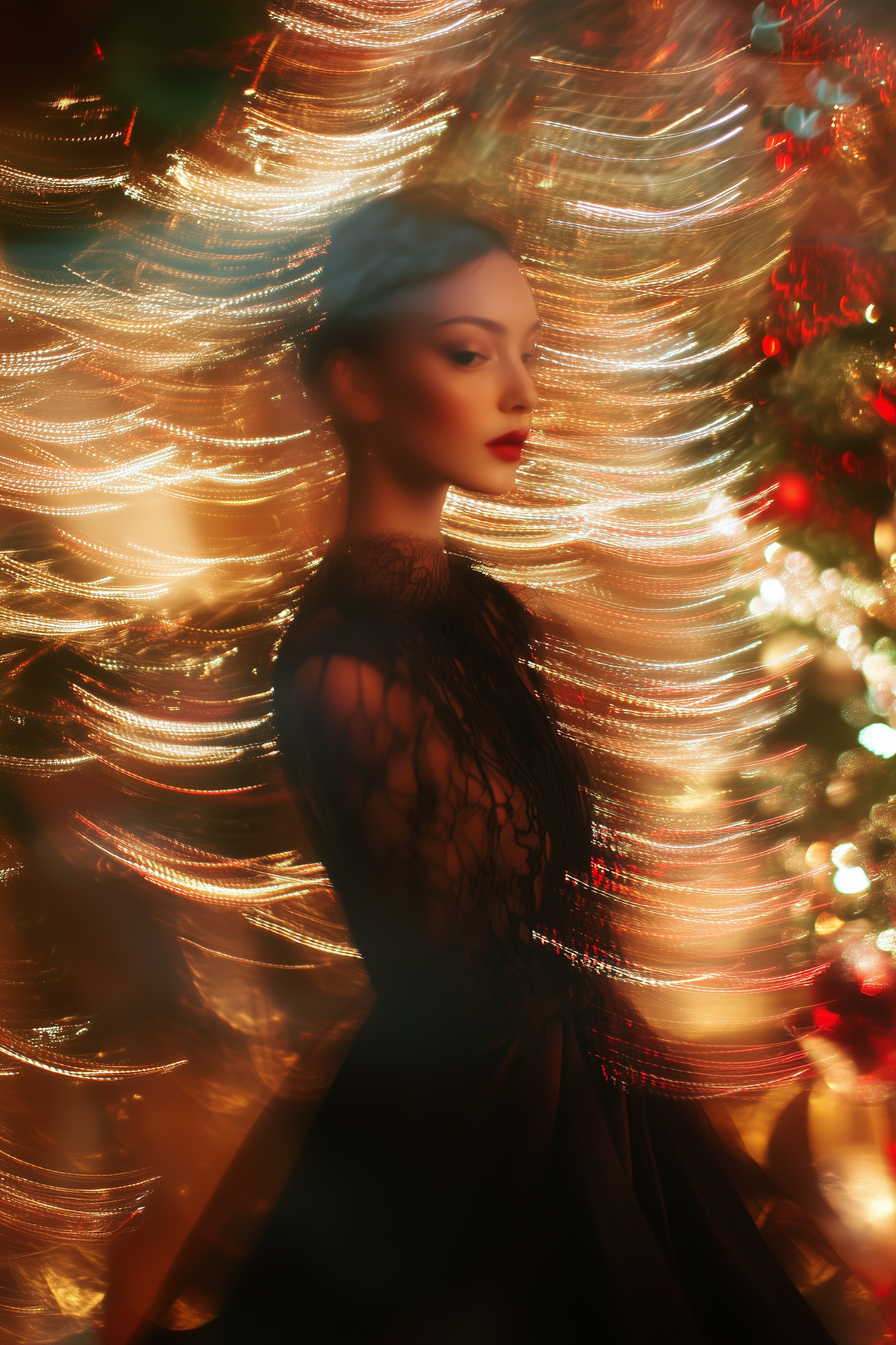 Ethereal portrait of a woman in a black lace dress with swirling golden lights, creating a festive and magical atmosphere.