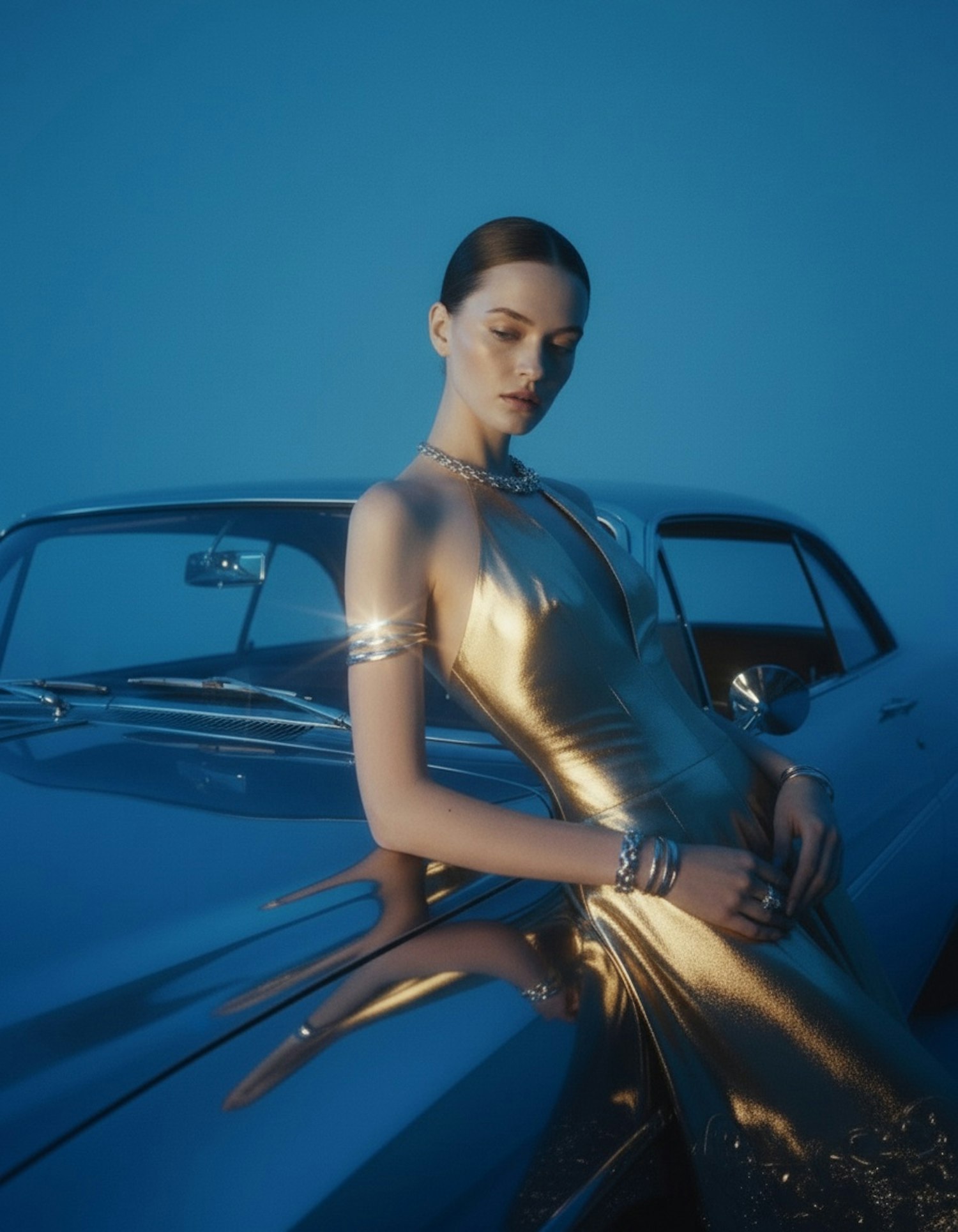 A woman in a golden dress leans on a vintage car under soft blue lighting, creating a luxurious and elegant atmosphere.