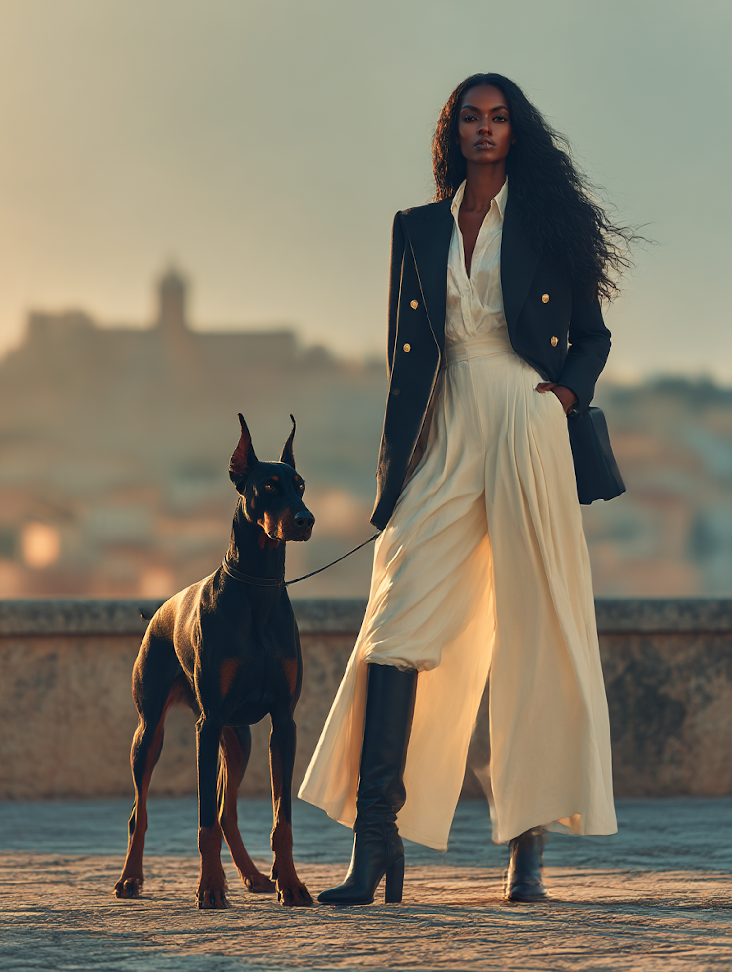 A stylish woman in a chic outfit stands with a poised Doberman, set against a warm, golden outdoor backdrop.