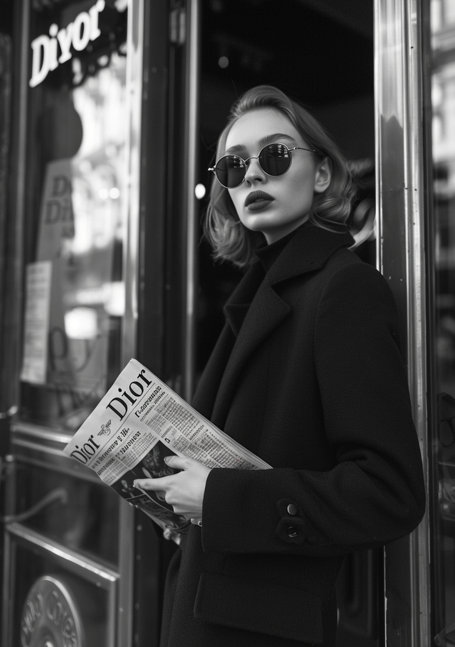 Stylish woman in sunglasses holding a Dior newspaper outside a store, exuding elegance in a black and white setting.