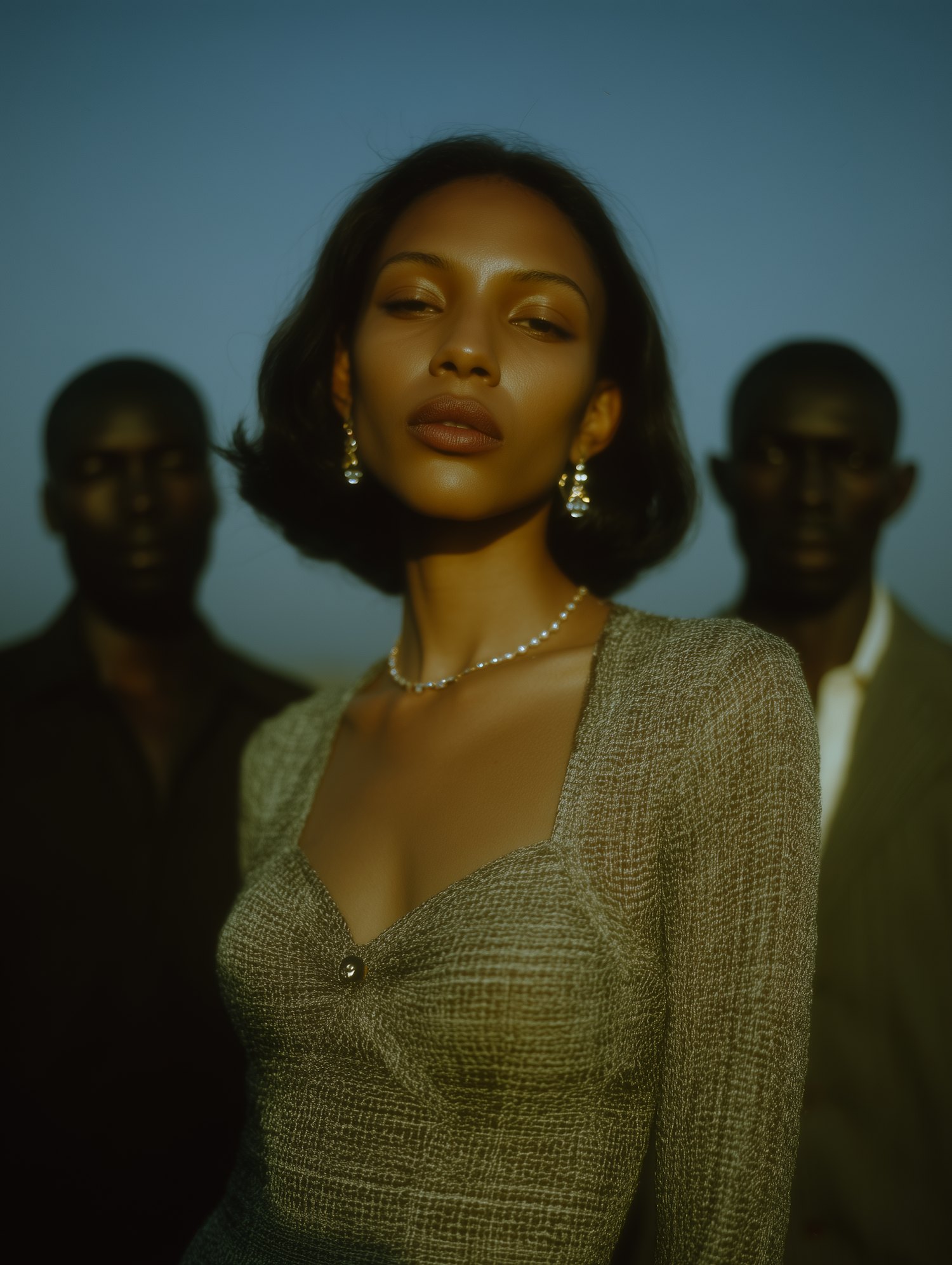 A stylish woman in a textured dress and pearl jewelry stands confidently, with two men in the background under soft twilight lighting.