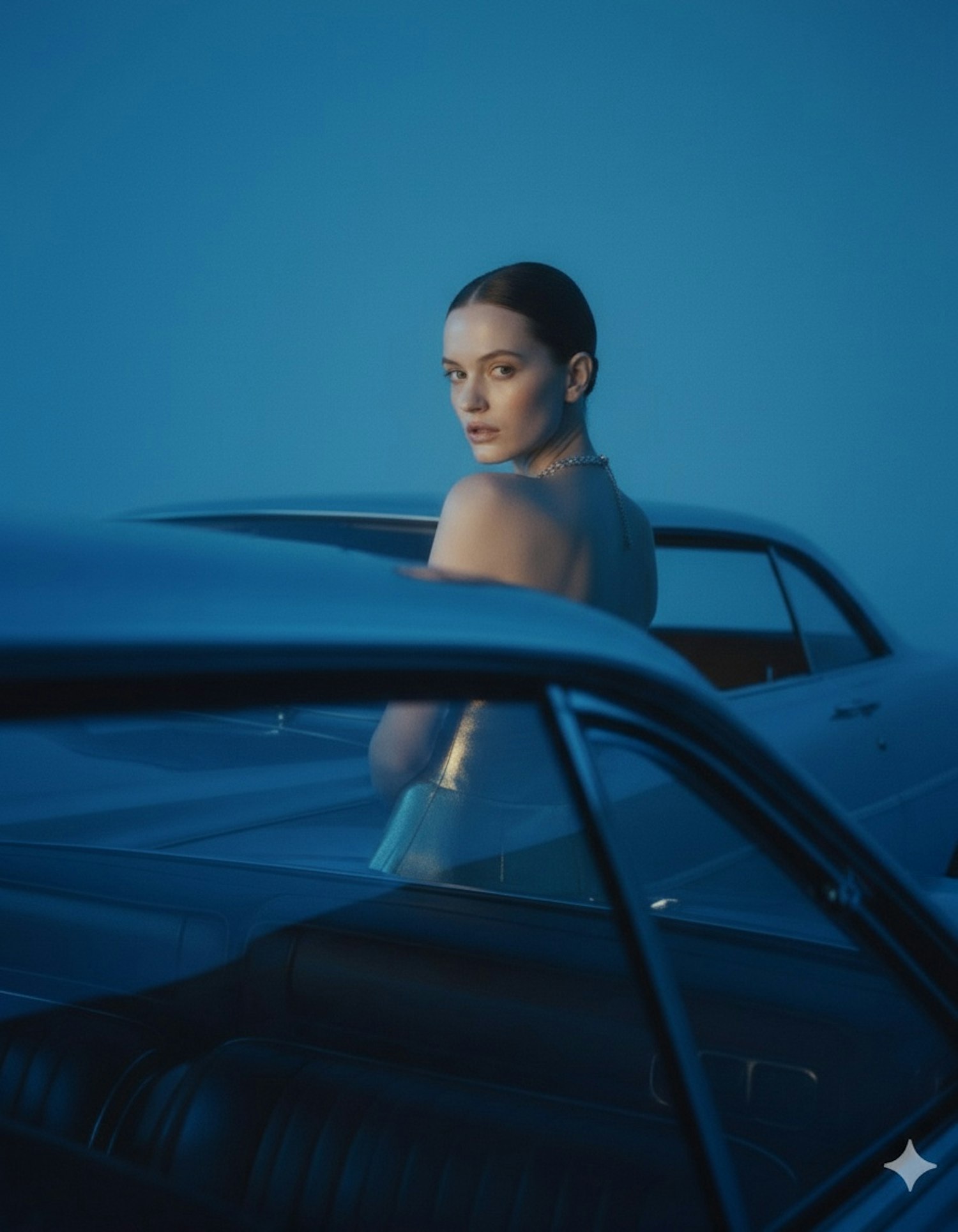 A woman in a sleek outfit stands near a vintage car under soft blue lighting, creating a cinematic and elegant atmosphere.