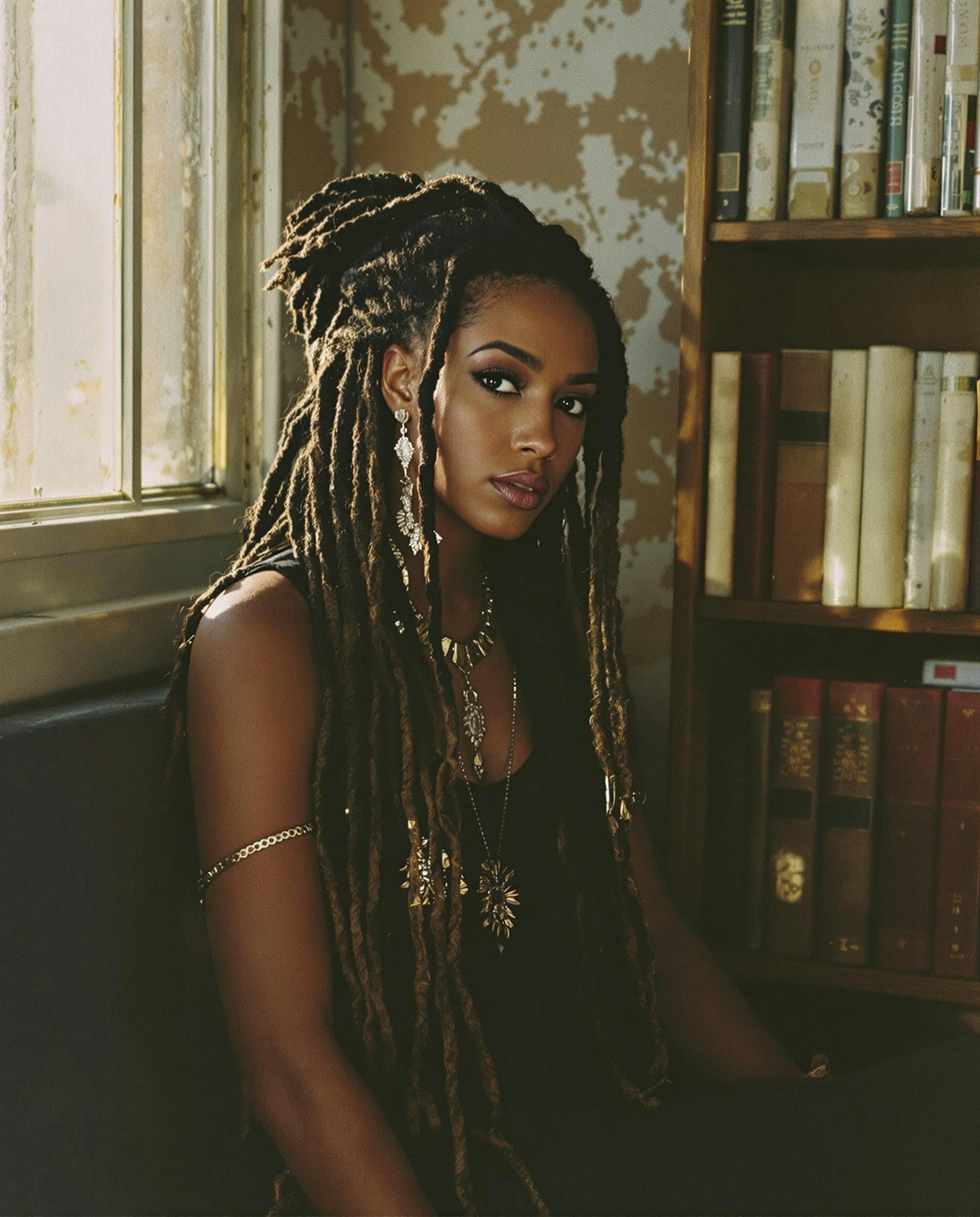 A stunning portrait of a woman with golden-brown dreadlocks, gold jewelry, and a vintage backdrop of books and textured wallpaper.