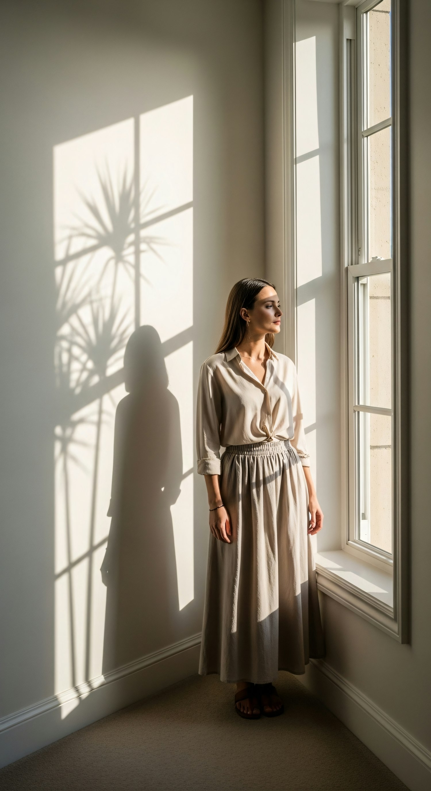 A woman in a beige outfit stands by a window, sunlight casting her shadow and a plant's silhouette on the wall. Minimalist and serene.