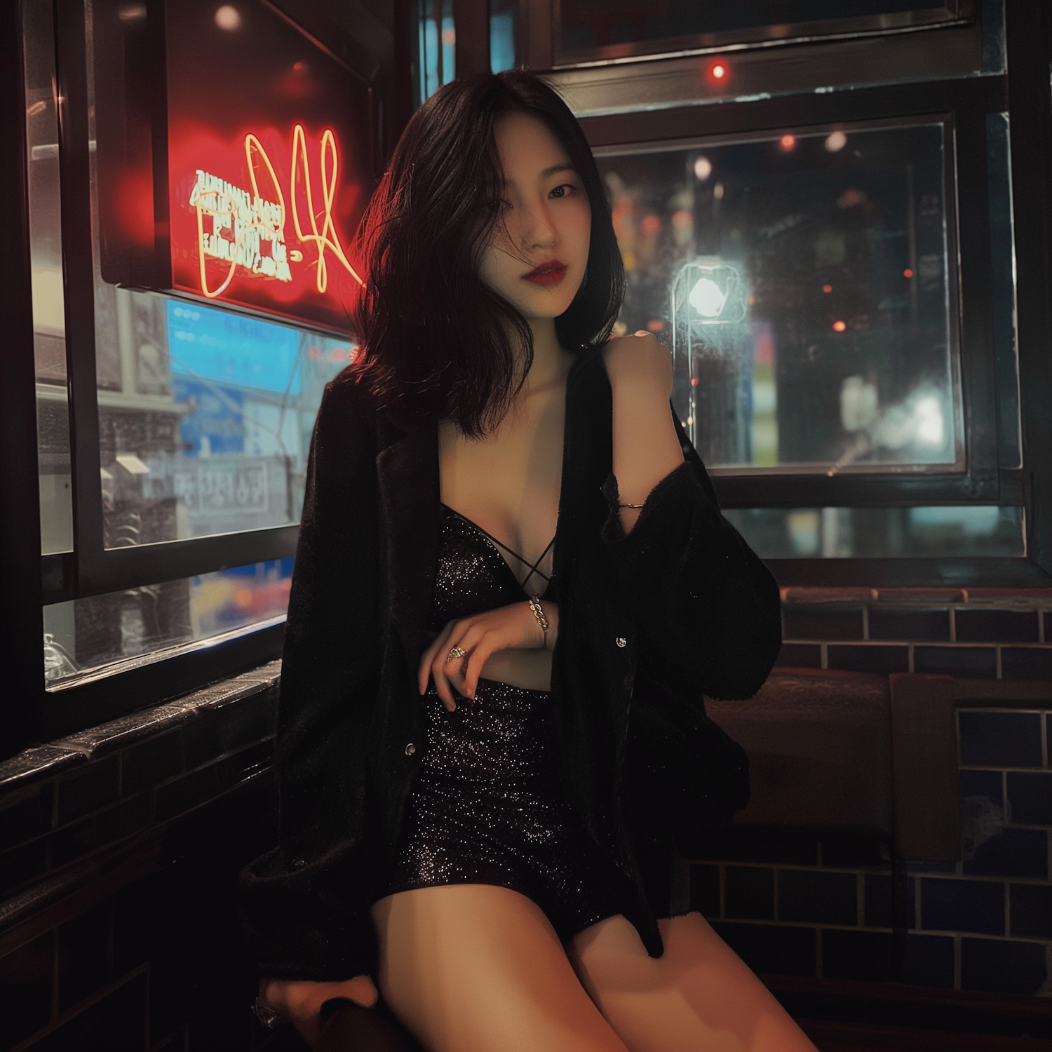 Stylish woman in a sparkling black dress with neon lights in a chic bar setting, exuding confidence and elegance.