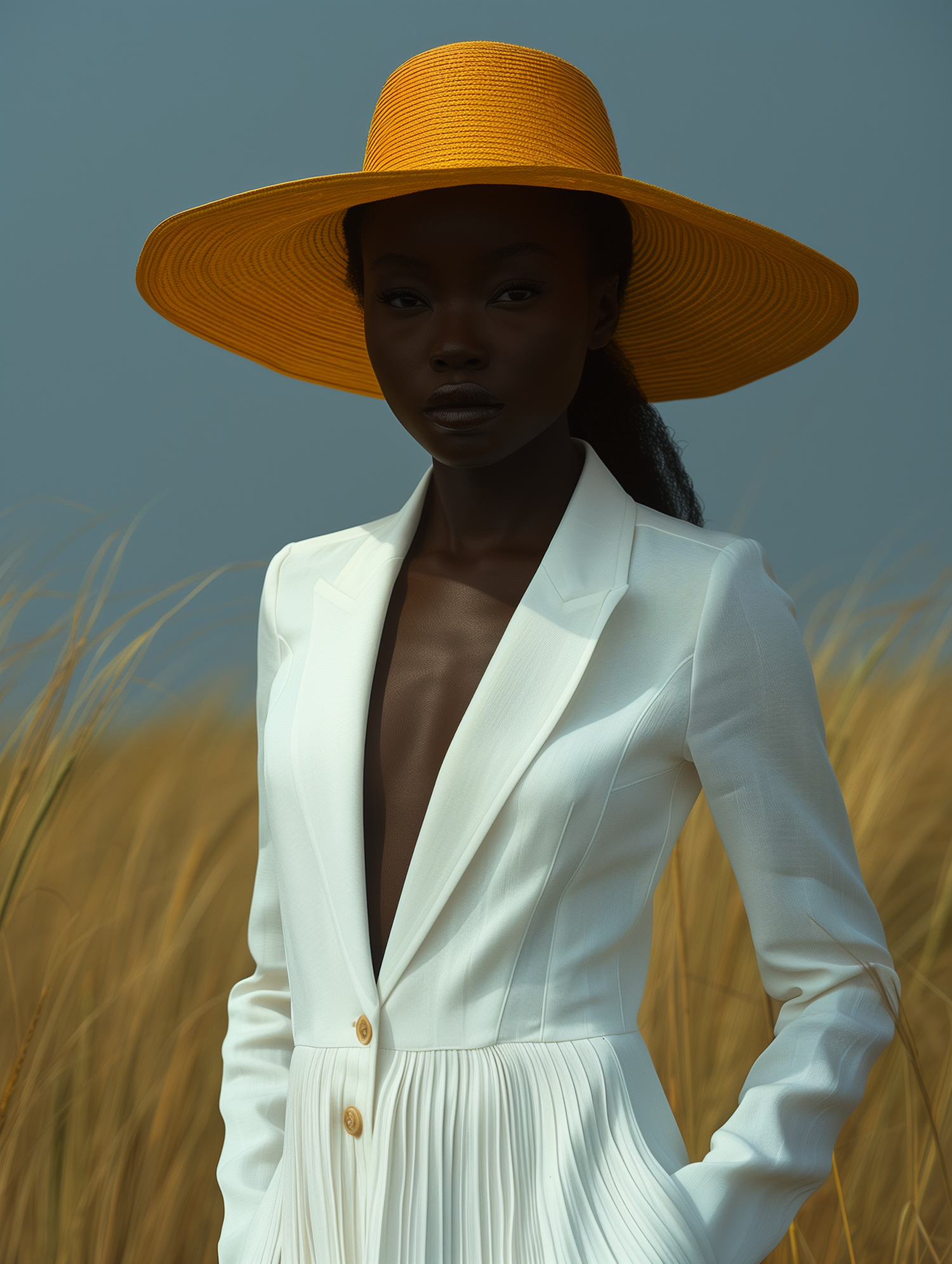 Elegant Black woman in a white blazer and yellow hat stands in a golden field, exuding confidence and style against a blue sky.