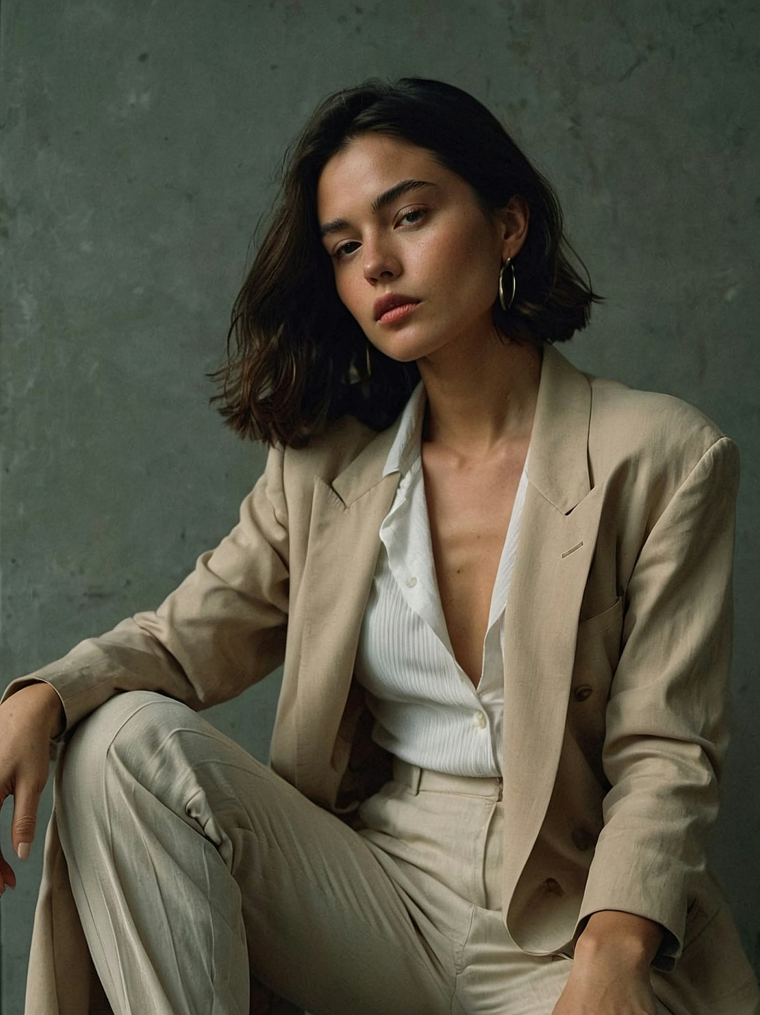 Woman in beige suit with hoop earrings, sitting confidently against a gray background. Elegant and poised with a calm expression.