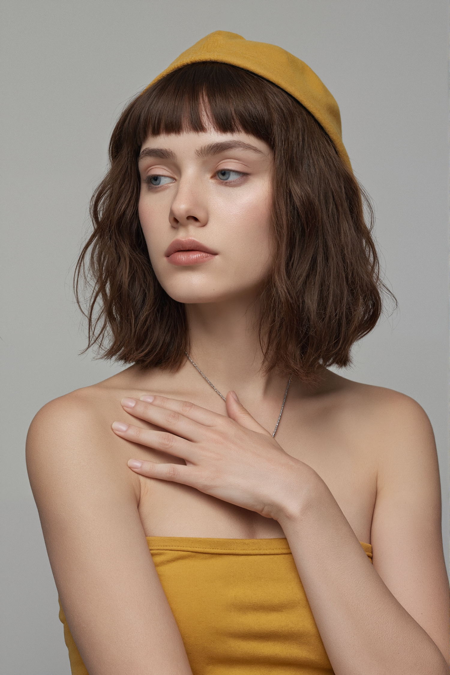 A thoughtful woman with wavy brown hair, a mustard beret, and matching top, gazes to the side with a calm expression against a gray background.