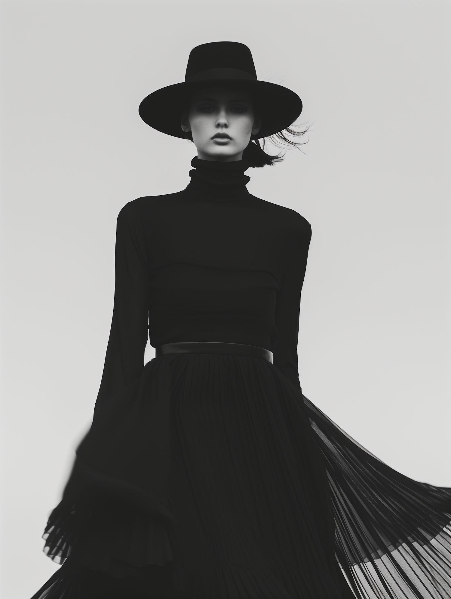 Elegant woman in monochrome, wearing a wide-brimmed hat and flowing dress, exuding style and grace in a dramatic black and white setting.