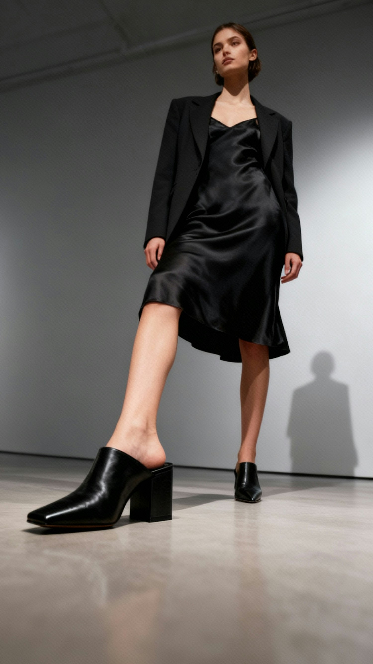 A stylish woman in a black satin dress and blazer, paired with black heeled mules, standing confidently in a minimalist setting.