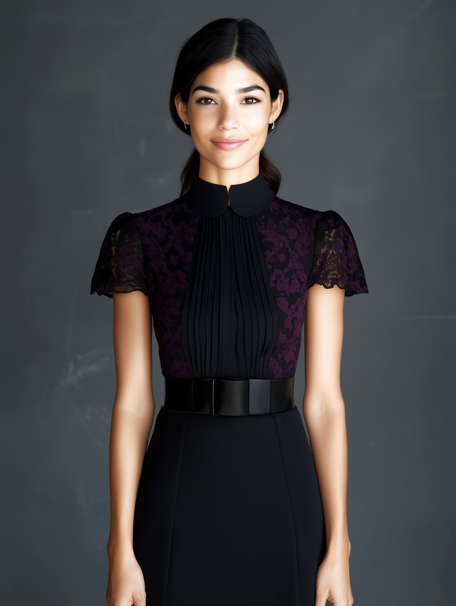 Elegant woman in a black and purple lace dress with a wide belt, standing against a gray background, exuding sophistication.