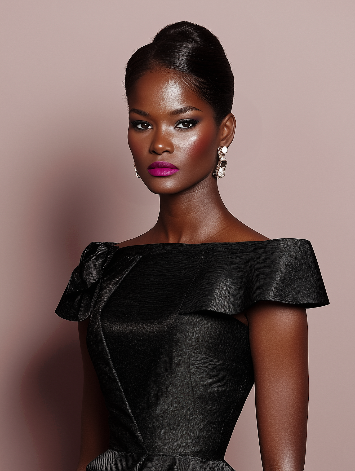 Elegant Black woman in a chic black dress with vibrant fuchsia lips and glamorous earrings, exuding confidence and style.
