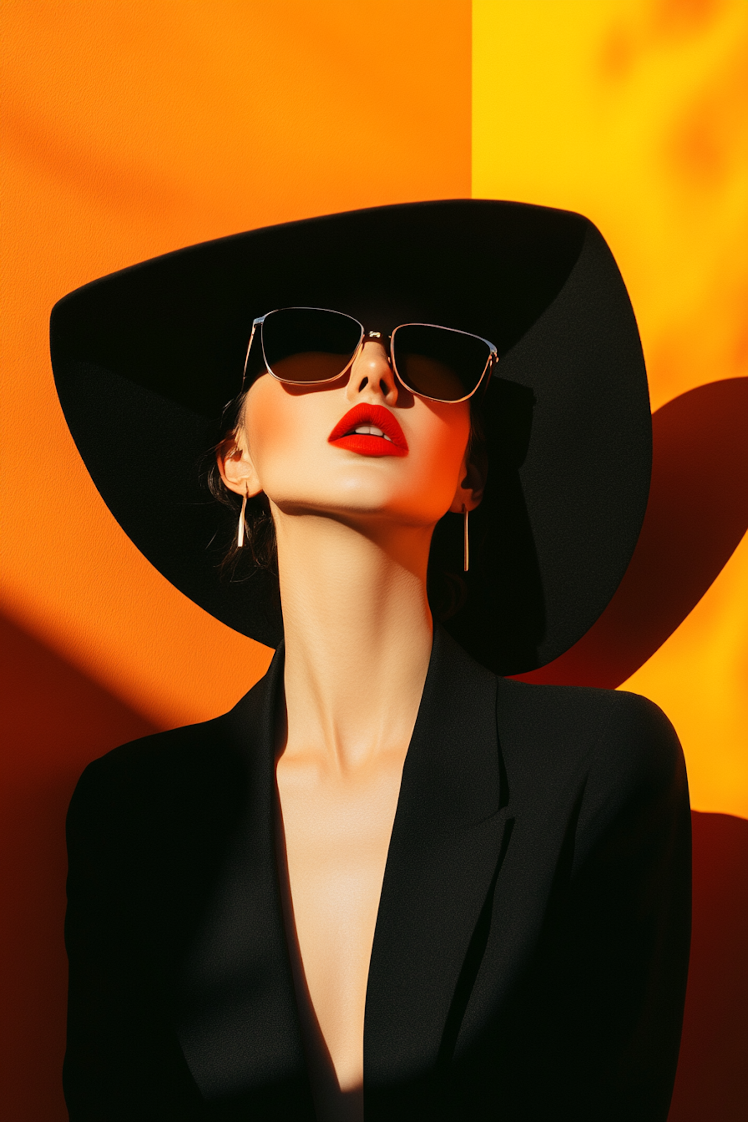 Elegant woman in black hat and sunglasses against a vibrant orange background, exuding sophistication and style.