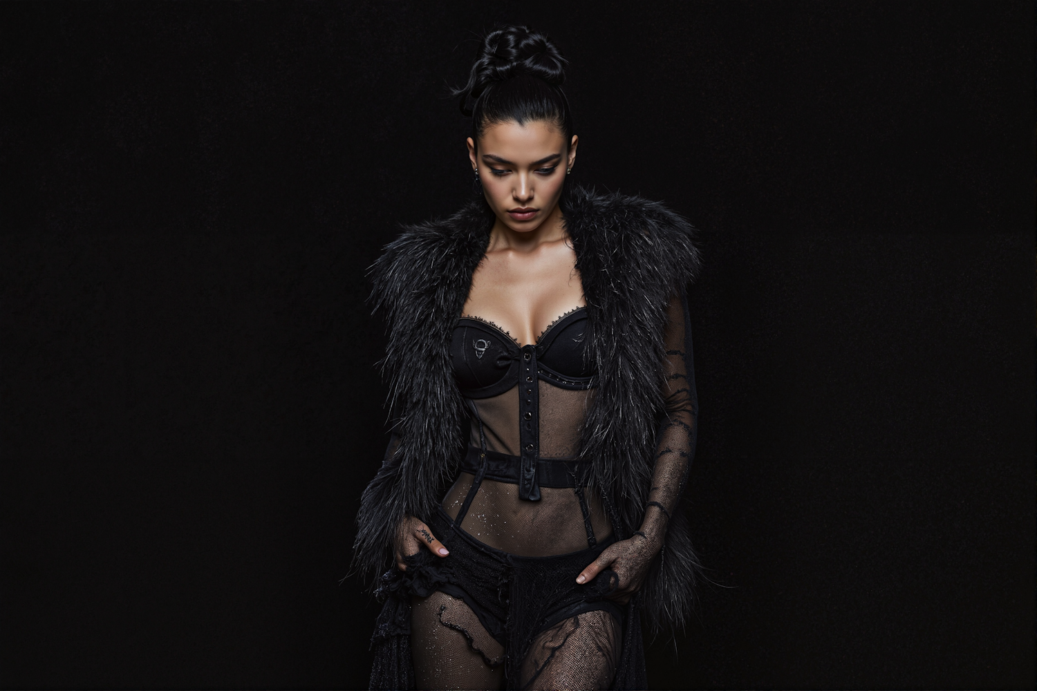 Elegant woman in black sheer bodysuit and fur vest, styled with a high bun, against a dark background.
