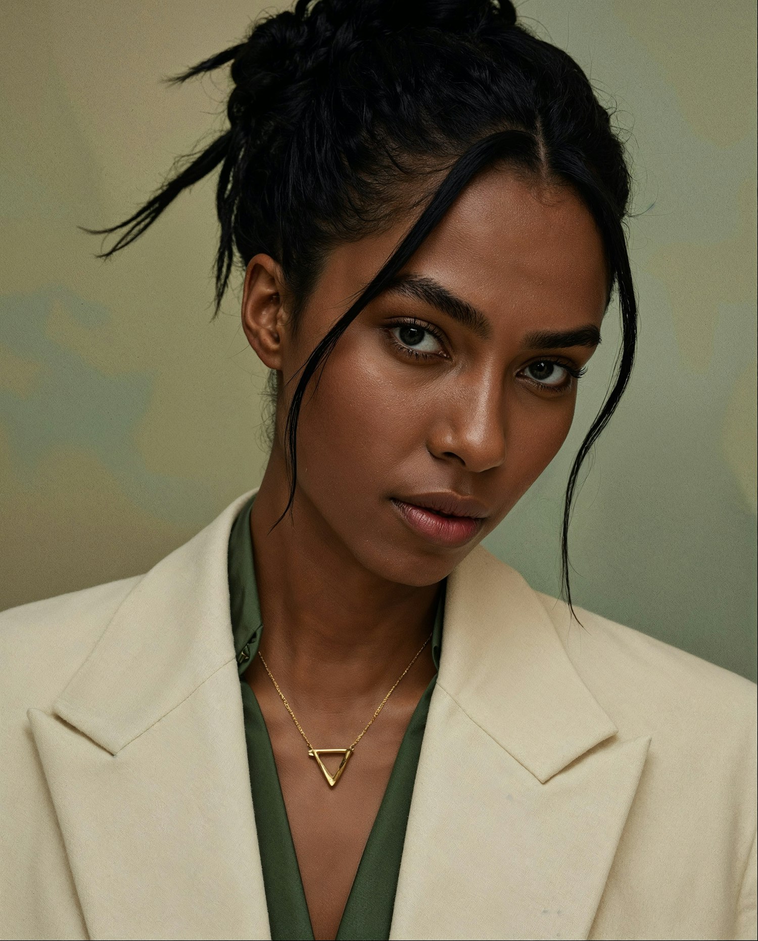 Elegant woman with dark skin in a beige blazer and green top, wearing a gold triangle necklace. Poised expression against a muted green background.