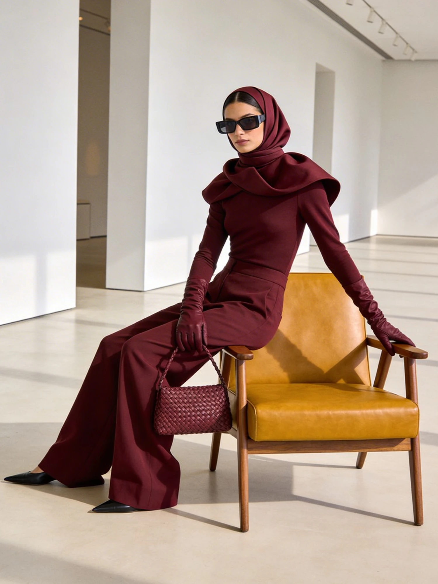 A high‑definition, minimalist editorial portrait in your signature Lummi creator style. A stylish person sits poised on the armrest of a mustard‑yellow leather chair with wooden supports, framed in a clean, gallery‑like space. They wear a fully monochrome deep‑burgundy ensemble: long‑sleeved top, wide‑leg trousers, and a matching hijab styled with sculptural precision. Accessories include dark rectangular sunglasses, fitted gloves, and a woven‑texture handbag in the same burgundy tone, creating a cohesive, intentional palette. They wear pointed black shoes. The composition is calm and architectural, with soft natural daylight, gentle shadows, and a warm, editorial glow. The background is pure minimalism — white wall, light flooring — allowing the rich tones and textures to stand out. No logos, no watermarks, no extra text.