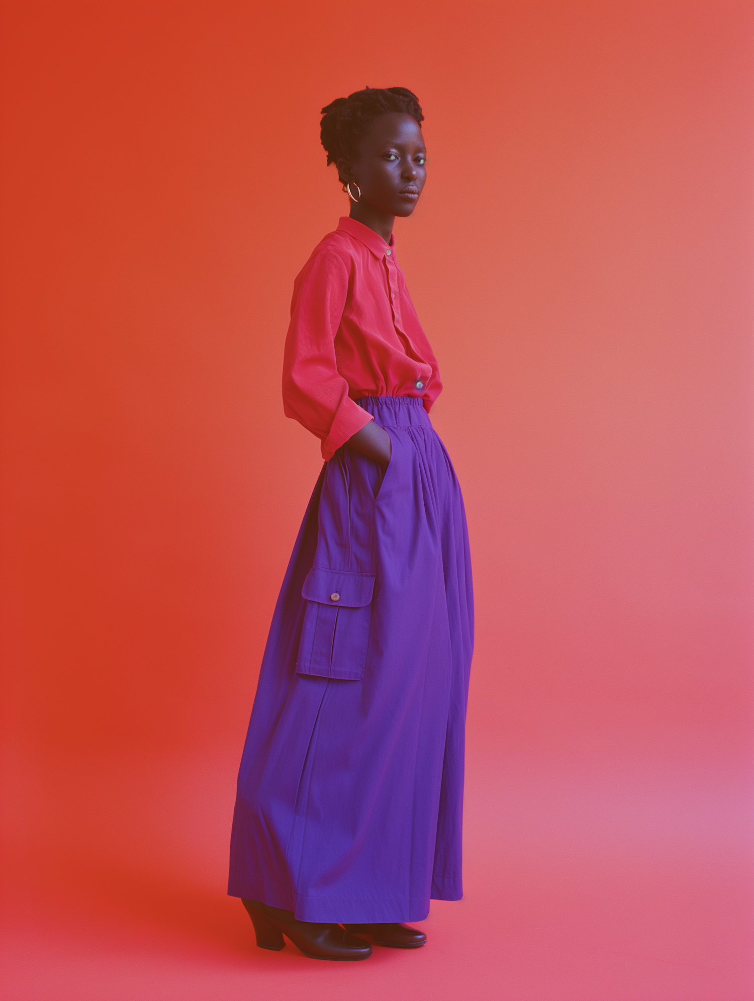 Stylish woman in red blouse and purple pants against a vibrant orange backdrop, exuding confidence and elegance.