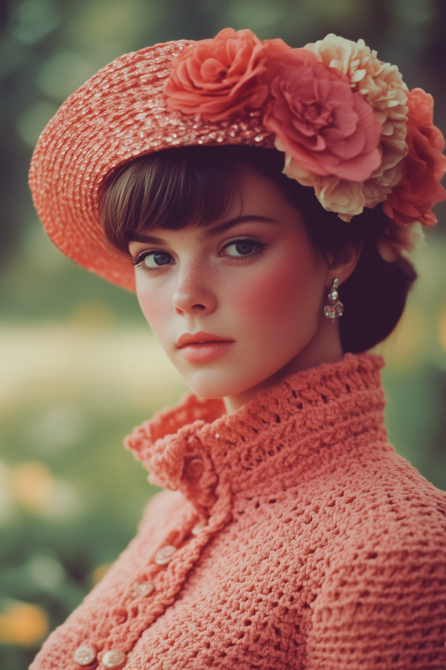 Elegant woman in coral hat and crochet top, exuding vintage charm with floral accents and serene expression in a garden setting.