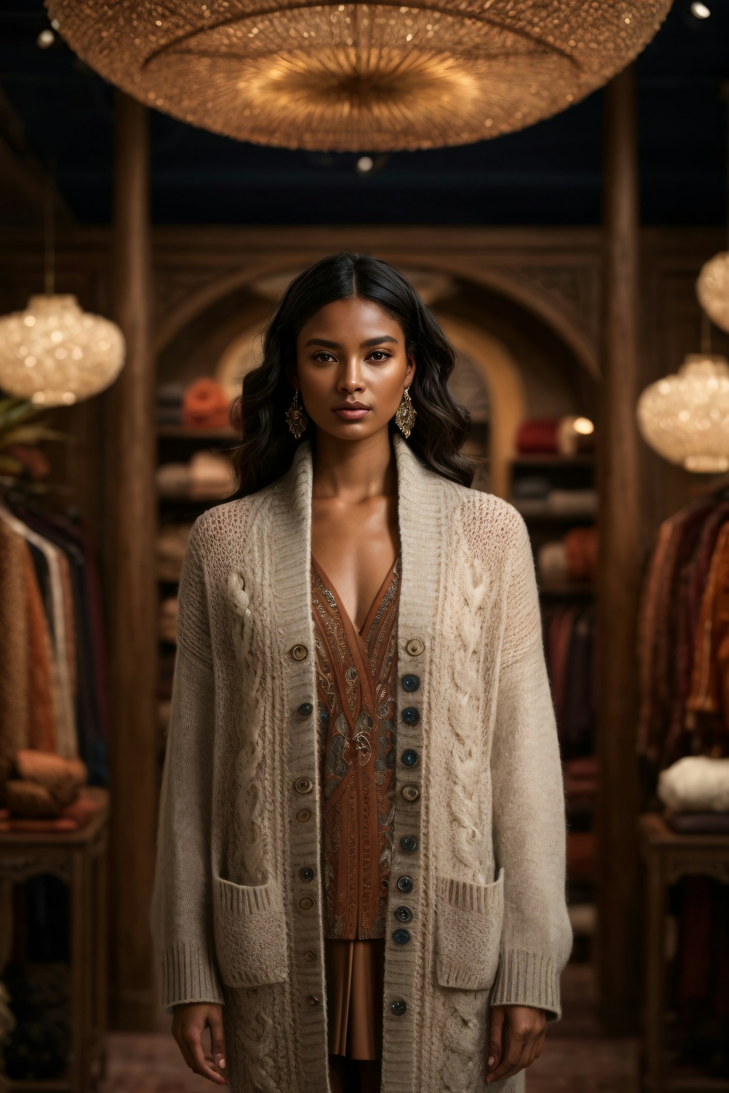 Elegant woman in a cozy, luxurious setting wearing a cream cardigan and gold earrings, surrounded by warm lighting and stylish decor.