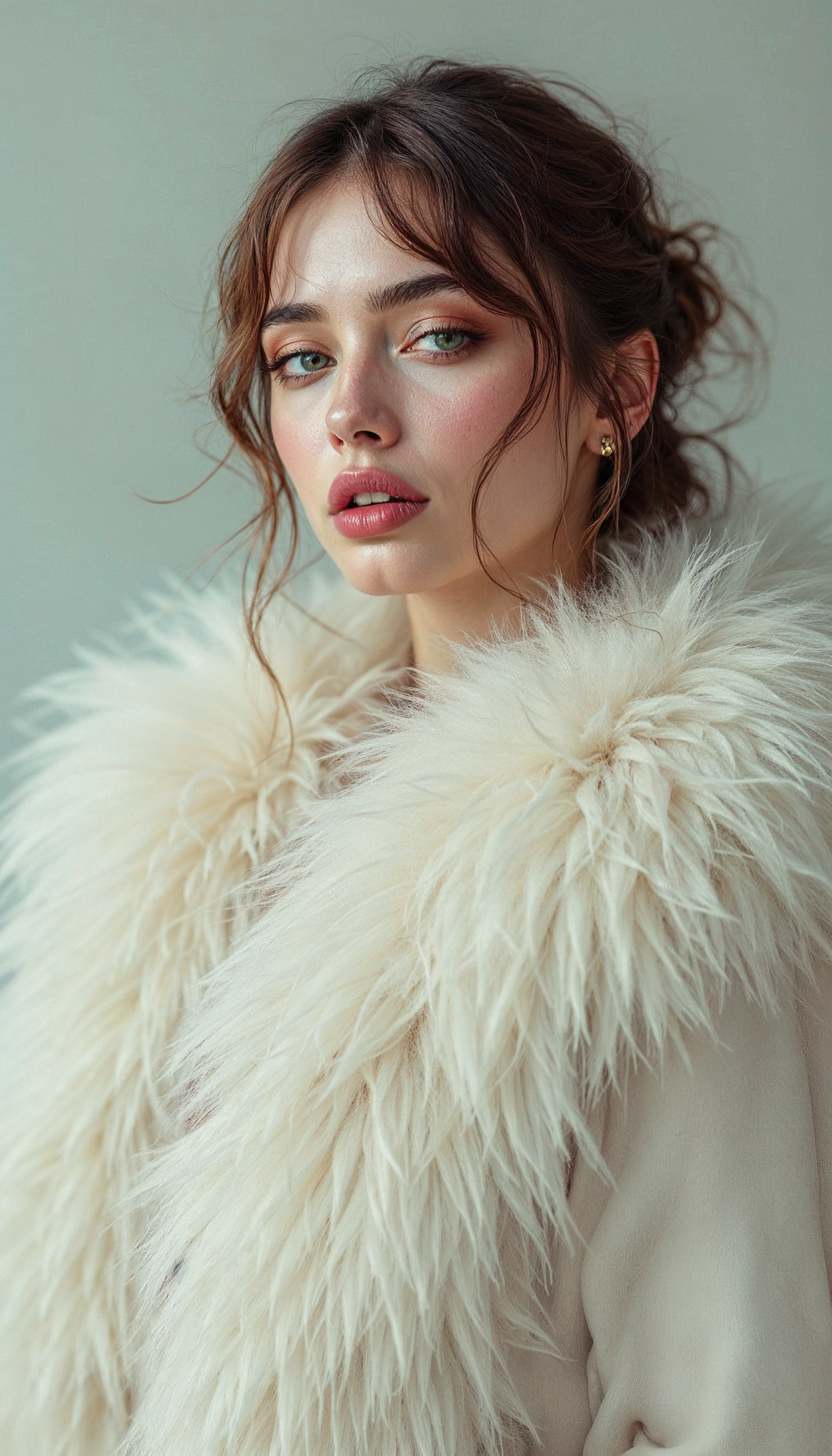 Elegant woman in a cream fur coat with wavy brown hair and blue eyes, exuding sophistication and style.