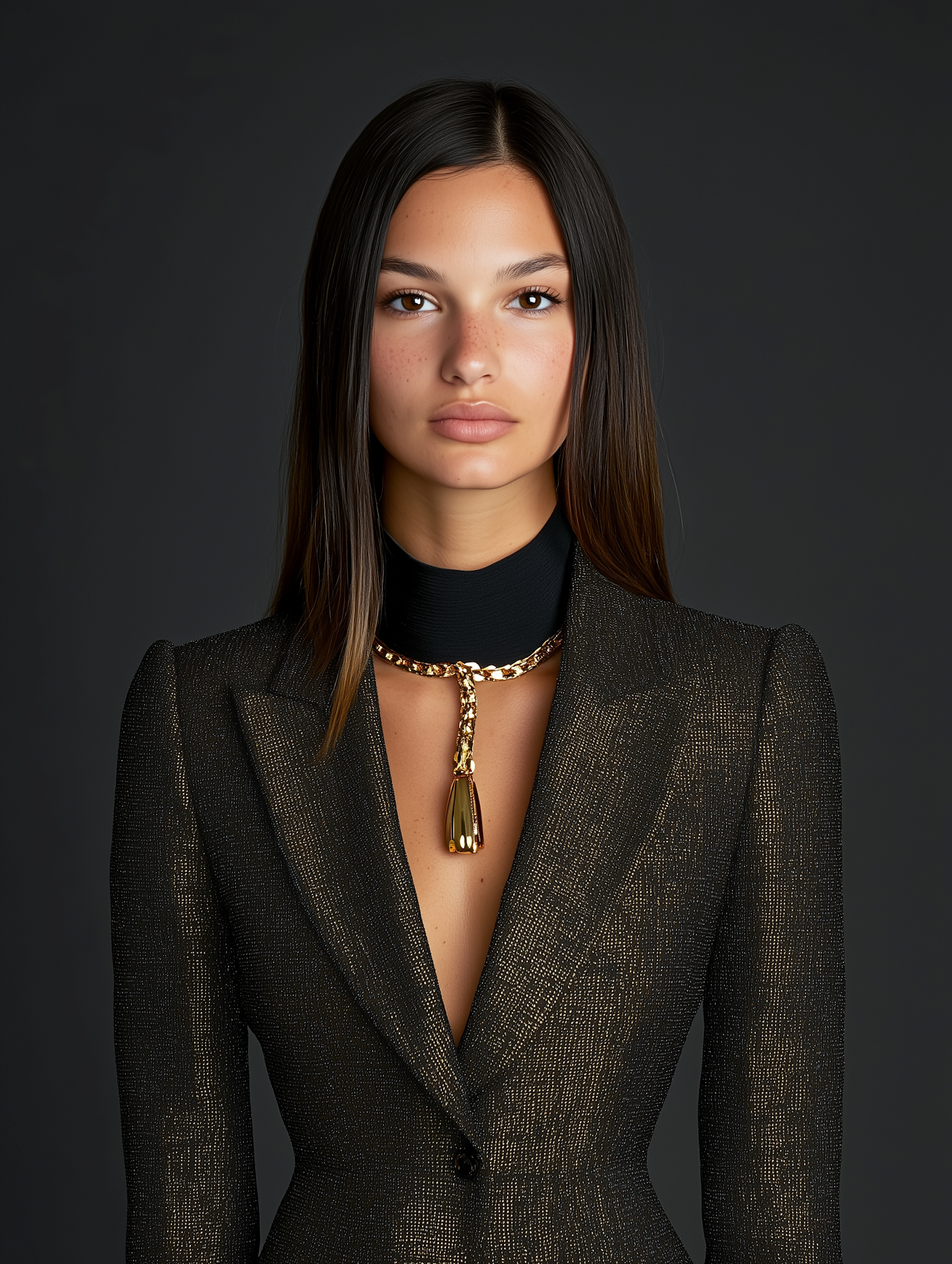 Elegant woman in a textured blazer with a gold necklace, exuding confidence against a dark background.