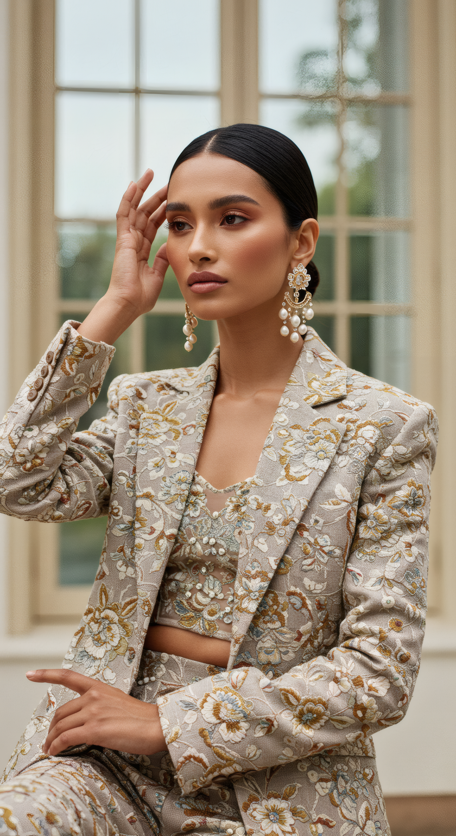 Elegant woman in floral suit with pearl earrings, posing gracefully indoors with a serene expression.