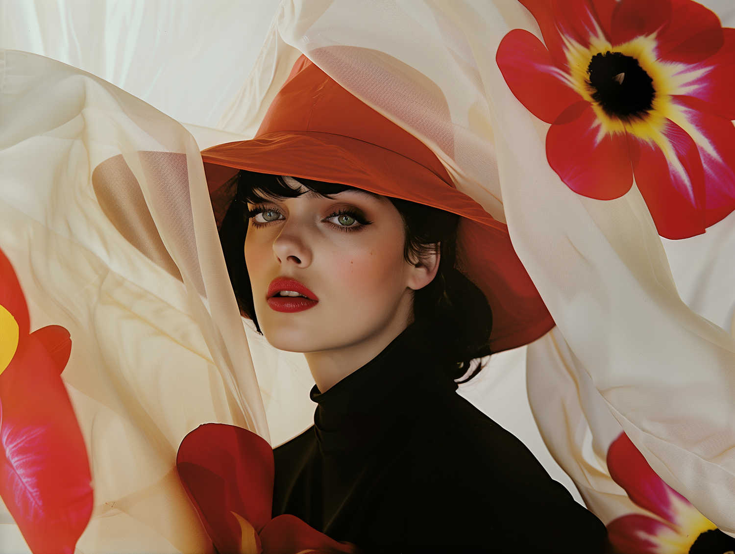Elegant woman in orange hat surrounded by flowing fabric with red flowers, creating a dynamic and artistic composition.