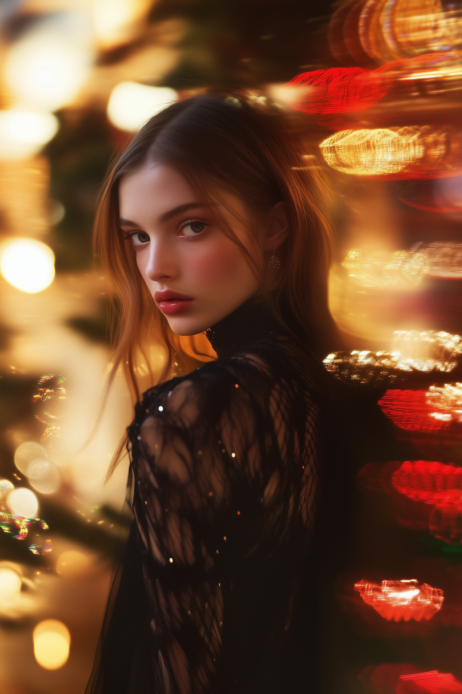 Elegant woman in black lace dress with festive bokeh lights, creating a dreamy and mysterious atmosphere.