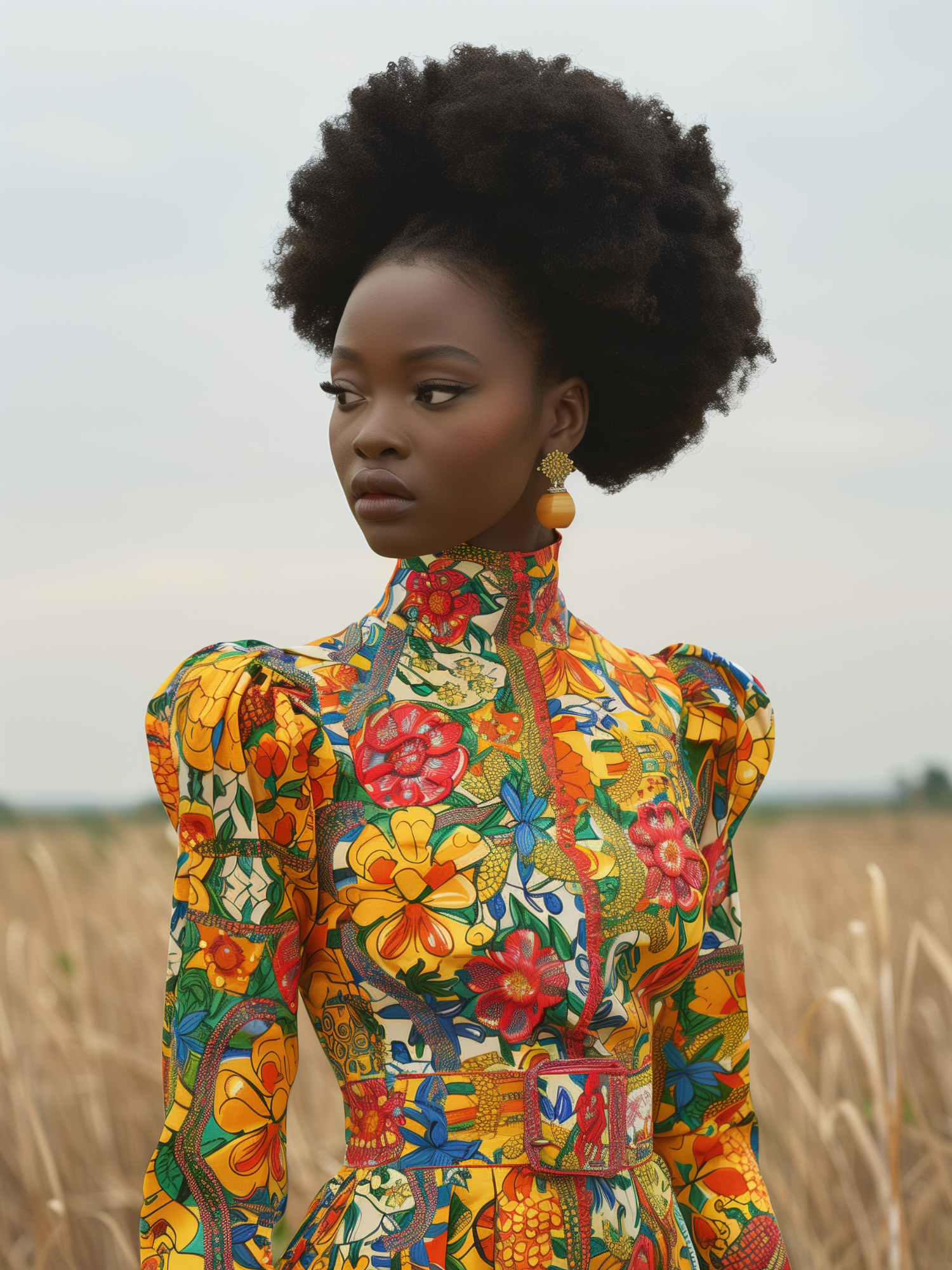 A striking portrait of a woman in a vibrant floral dress, standing in a serene field under an overcast sky.