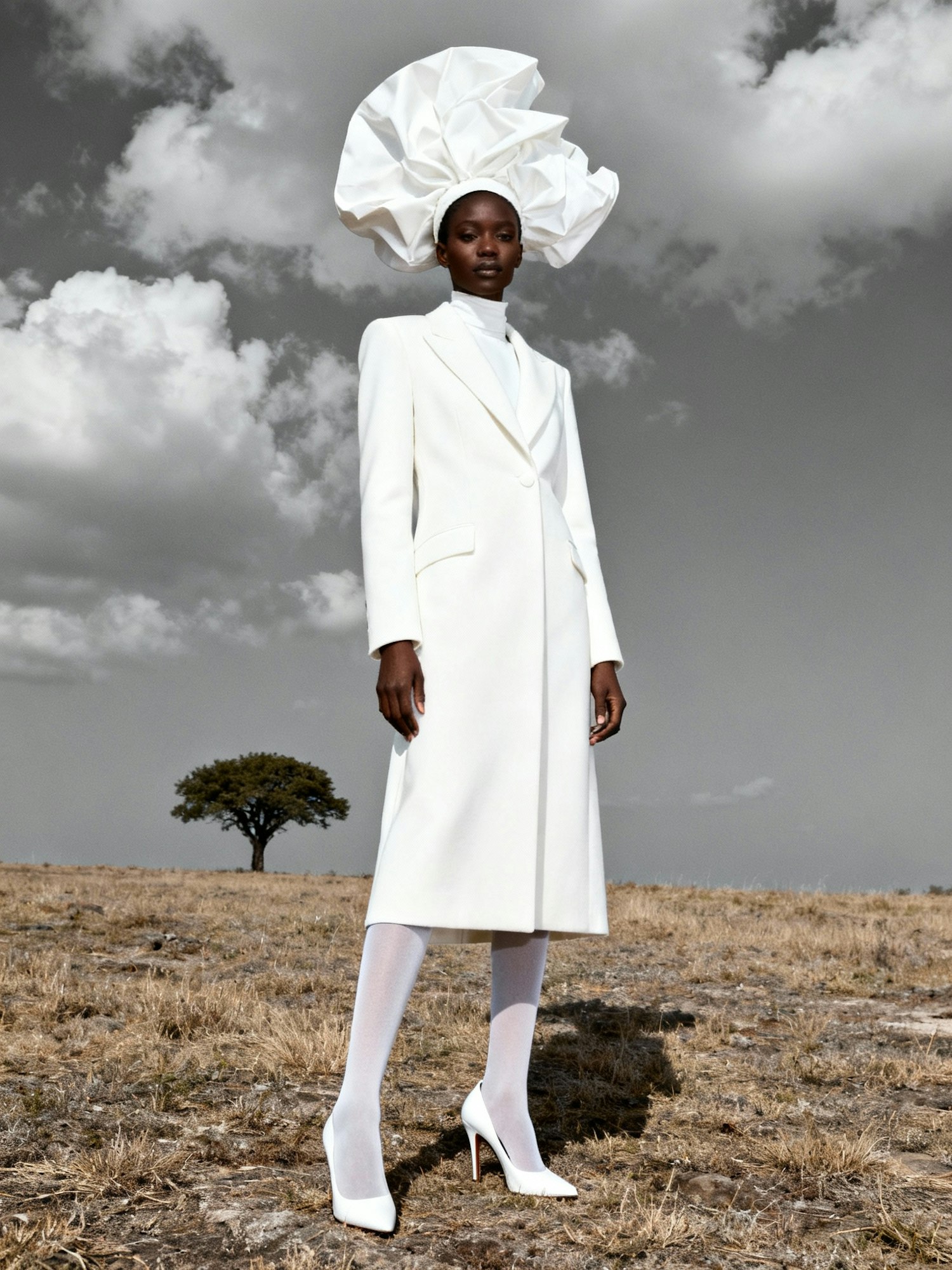 Full-body, high-definition portrait of a Black woman wearing a striking all-white outfit: a long white coat, white tights, and white high-heeled shoes. She wears a large, sculptural white headpiece. Her expression is serene and composed. She stands on dry, grassy terrain beneath a dramatic sky with scattered clouds and a lone tree in the distance. The neutral gray background enhances the white tones of her outfit, making the layered textures stand out. Lighting is soft and directional, casting gentle highlights across her face and garment. The mood is ethereal, bold, and editorial—ideal for an Afro-fusion fashion portrait or symbolic identity showcase