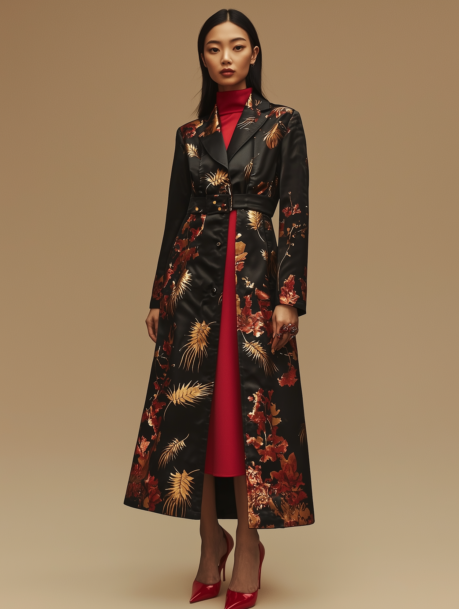 Elegant Asian woman in a black floral coat and red dress, exuding sophistication and style with matching red heels.
