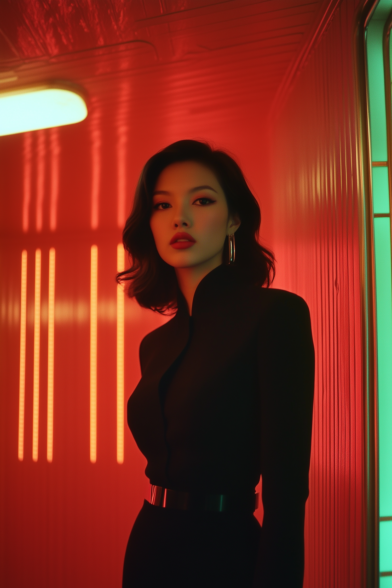 Asian woman in a futuristic setting with neon lights, wearing a black outfit and hoop earrings, exuding elegance and confidence.