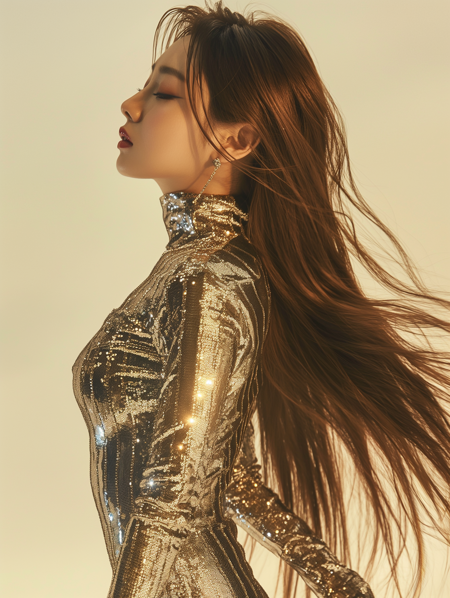 Elegant woman in a shimmering gold dress with flowing hair and bold makeup, exuding grace and glamour.