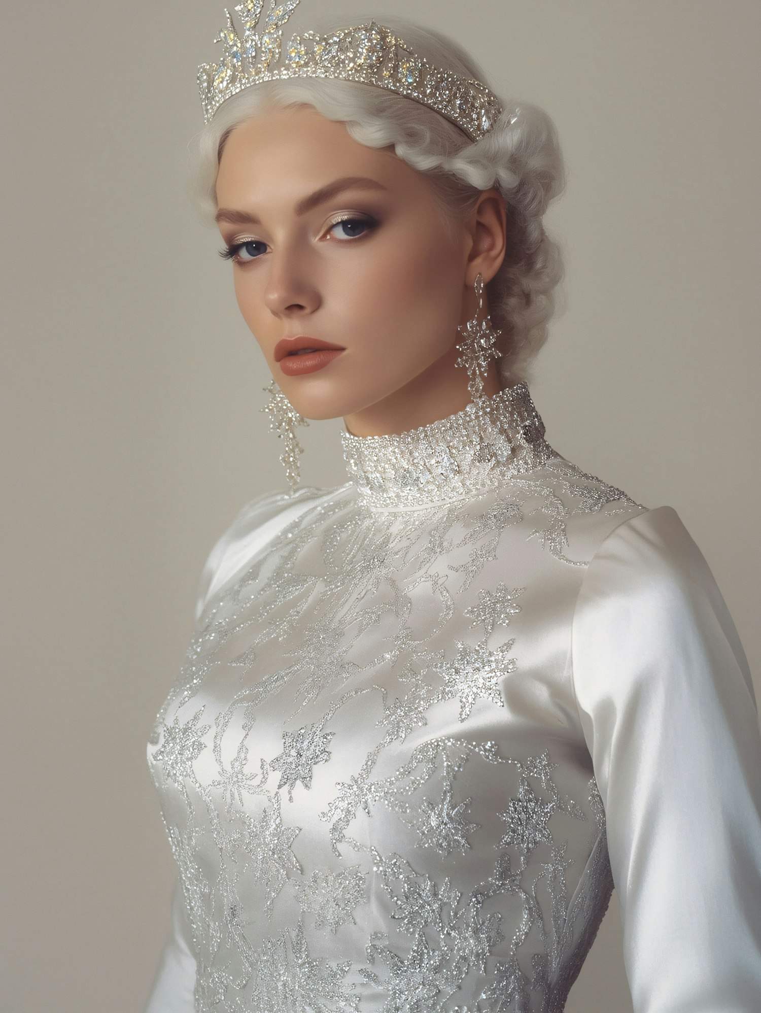 A regal woman in a white gown with silver embroidery, wearing a tiara and chandelier earrings, exuding elegance and sophistication.