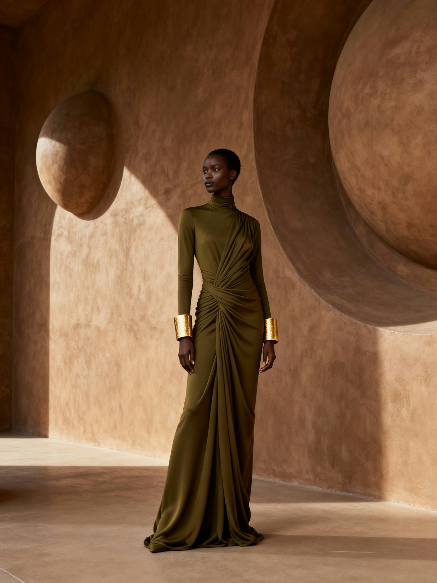 A woman in an olive-green gown with gold cuffs stands against a textured, earthy-toned wall with rounded architectural elements.