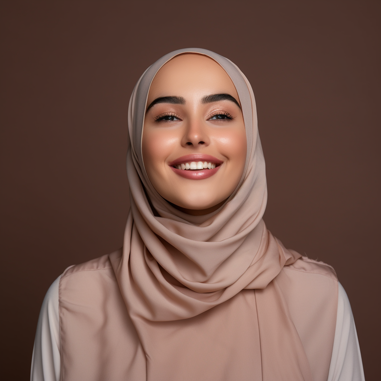 Smiling woman in beige hijab against a warm brown background, exuding joy and confidence.