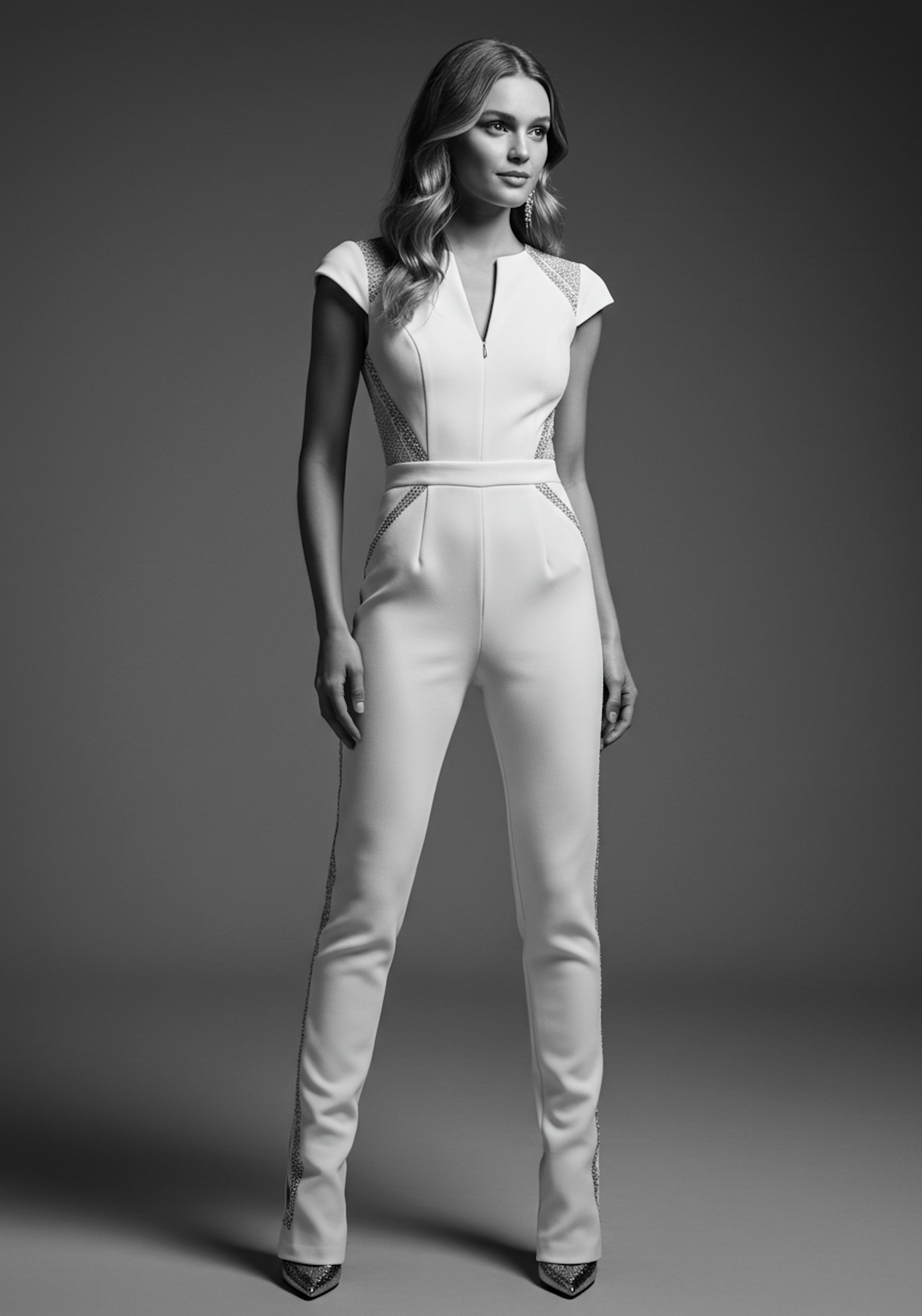 Elegant black-and-white shot of a woman in a chic white jumpsuit with intricate details, exuding modern sophistication.