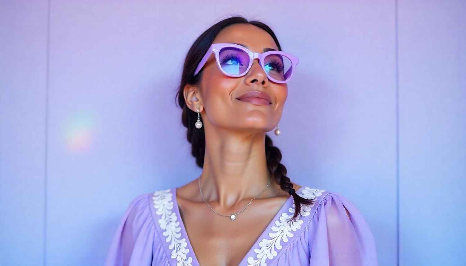 Stylish woman in purple sunglasses and embroidered blouse, gazing upwards against a matching purple background.