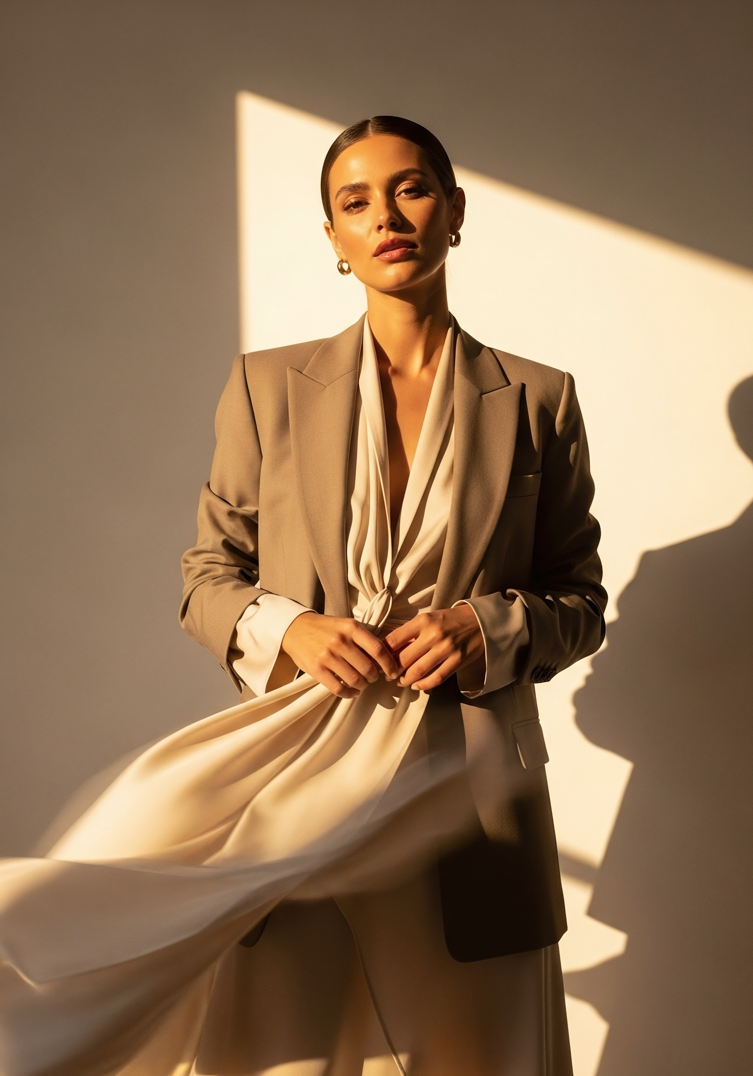 A stylish woman in a beige blazer and white blouse stands in warm sunlight, with dramatic shadows and flowing fabric adding elegance.