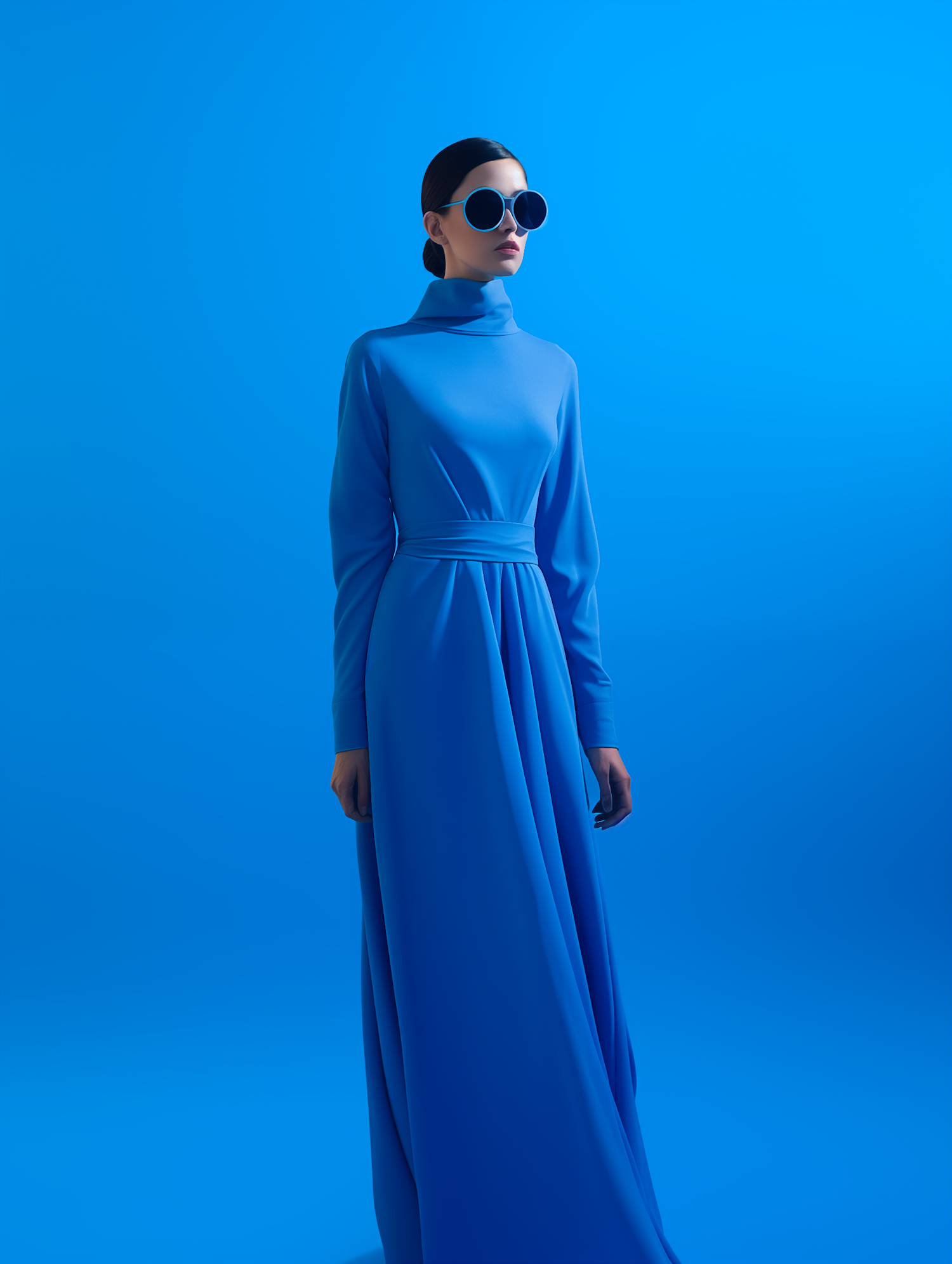 Elegant woman in a blue dress and sunglasses against a vibrant blue background, exuding modern sophistication and style.