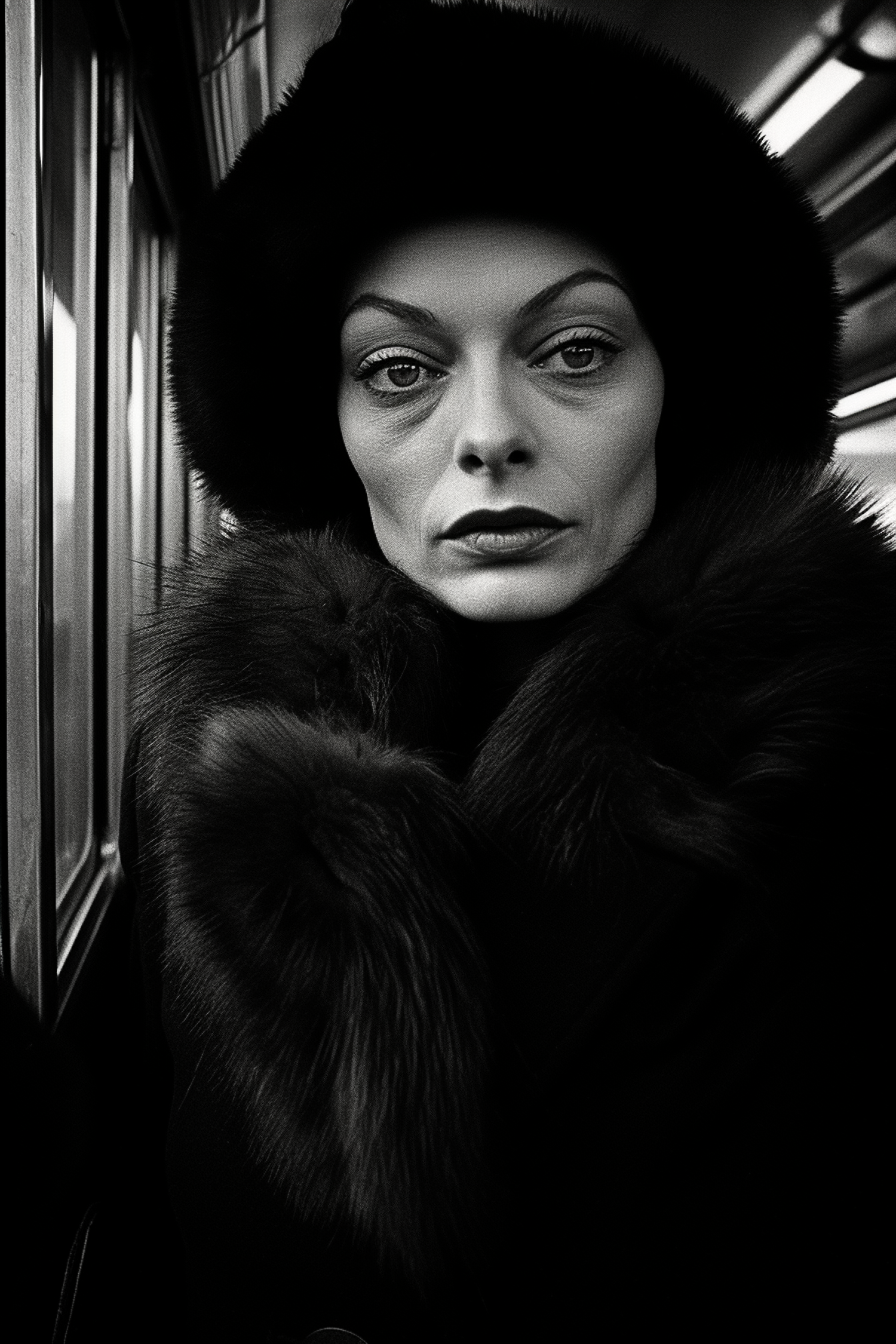 Elegant woman in fur coat and hat, intense gaze, black and white portrait, dramatic and sophisticated style.
