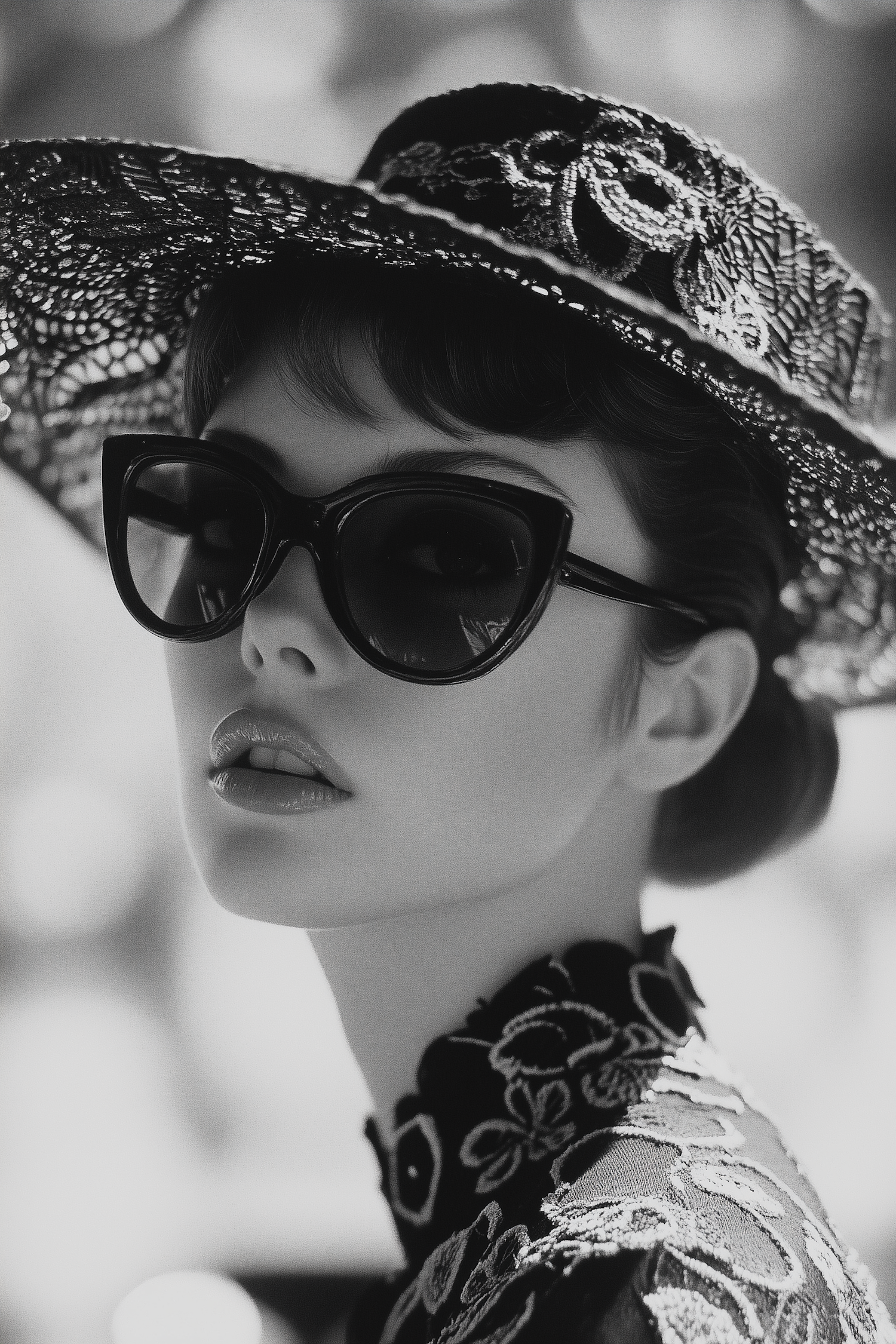 Elegant black and white portrait of a woman in sunglasses and a lace hat, exuding vintage glamour and sophistication.