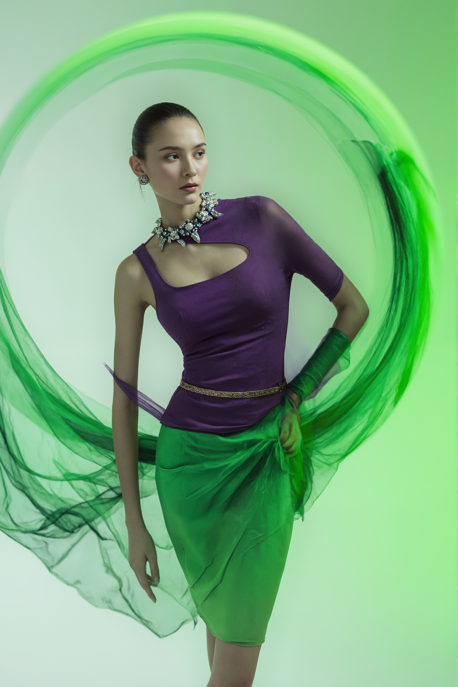Elegant woman in purple and green attire with swirling fabric, accessorized with bold jewelry, set against a soft green background.