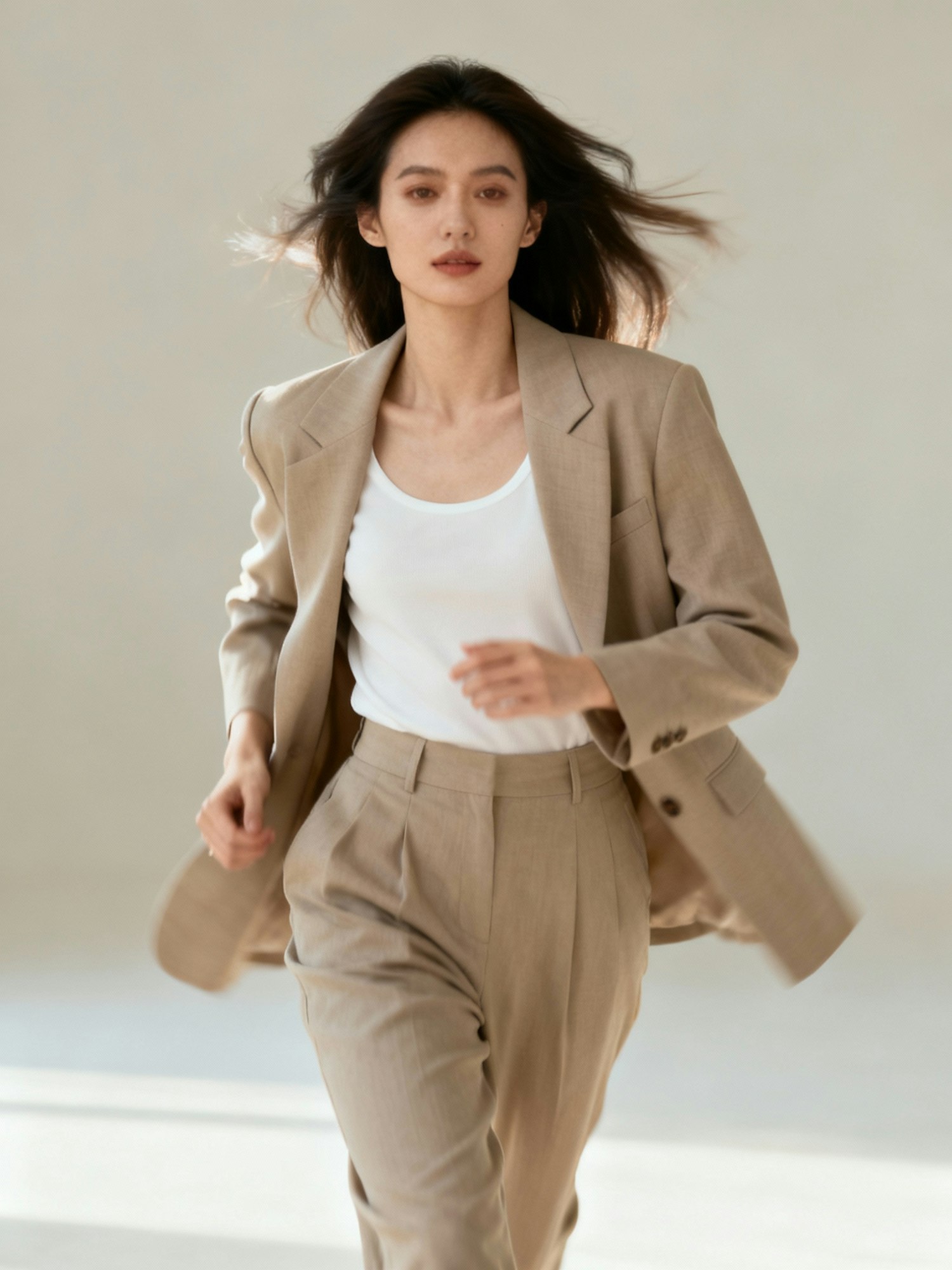 A woman in a beige suit and white top moves gracefully, her hair flowing naturally, set against a softly lit neutral background.