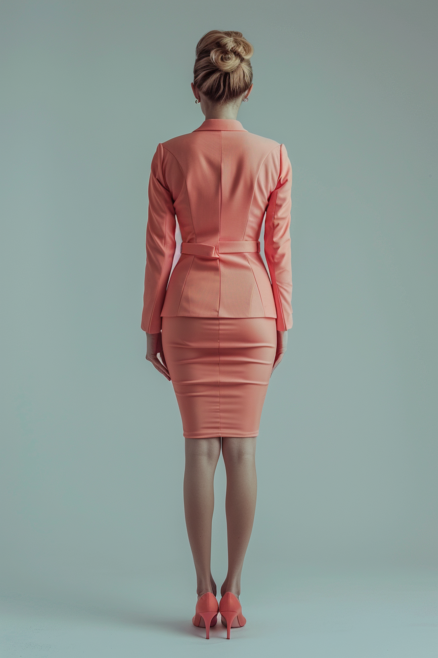 Woman in coral suit with elegant bun hairstyle, standing confidently against a muted gray background.