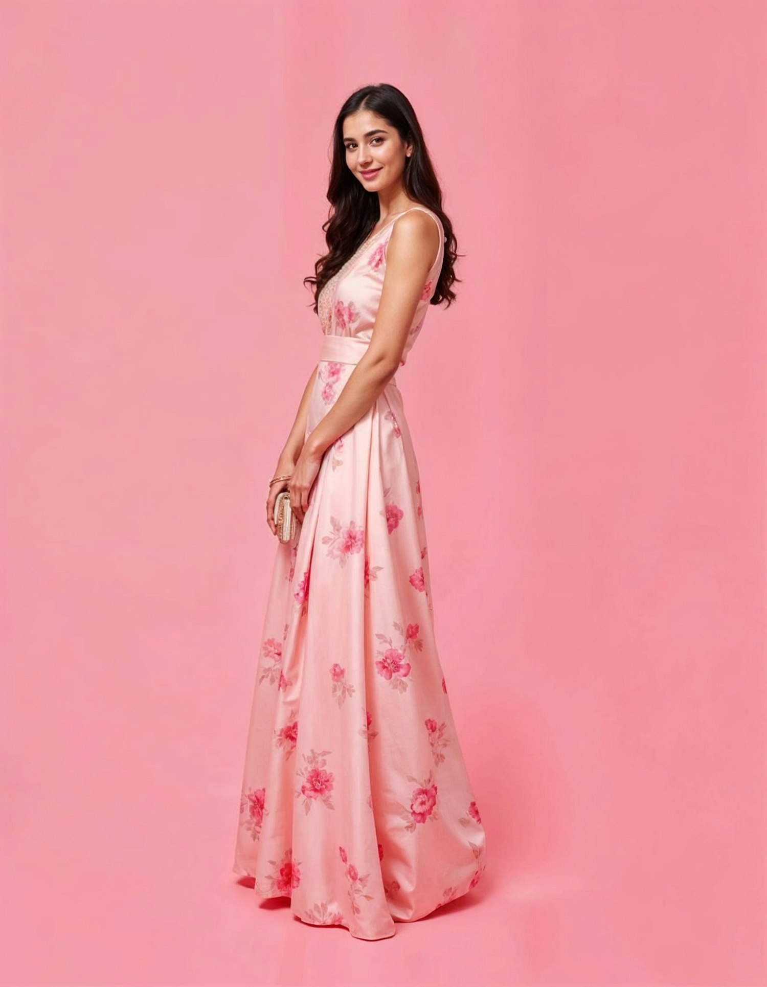 Elegant woman in a floral pink gown against a matching pink background, holding a clutch with a gentle smile.