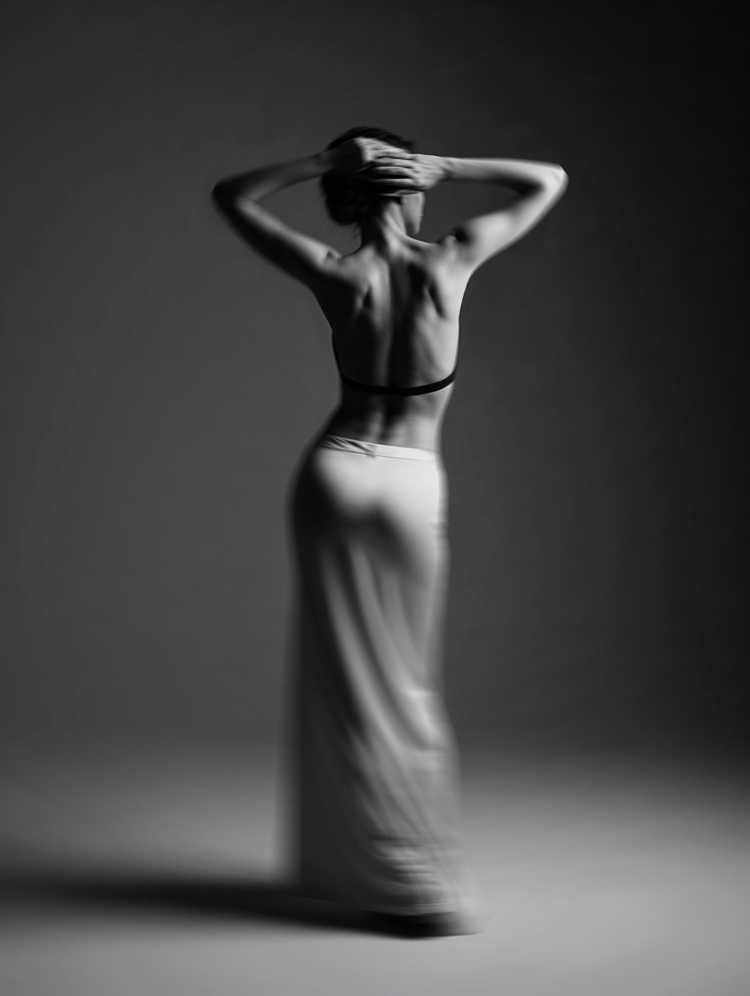Elegant black-and-white photo of a woman in a flowing skirt, back turned, hands on head, emphasizing form and texture.
