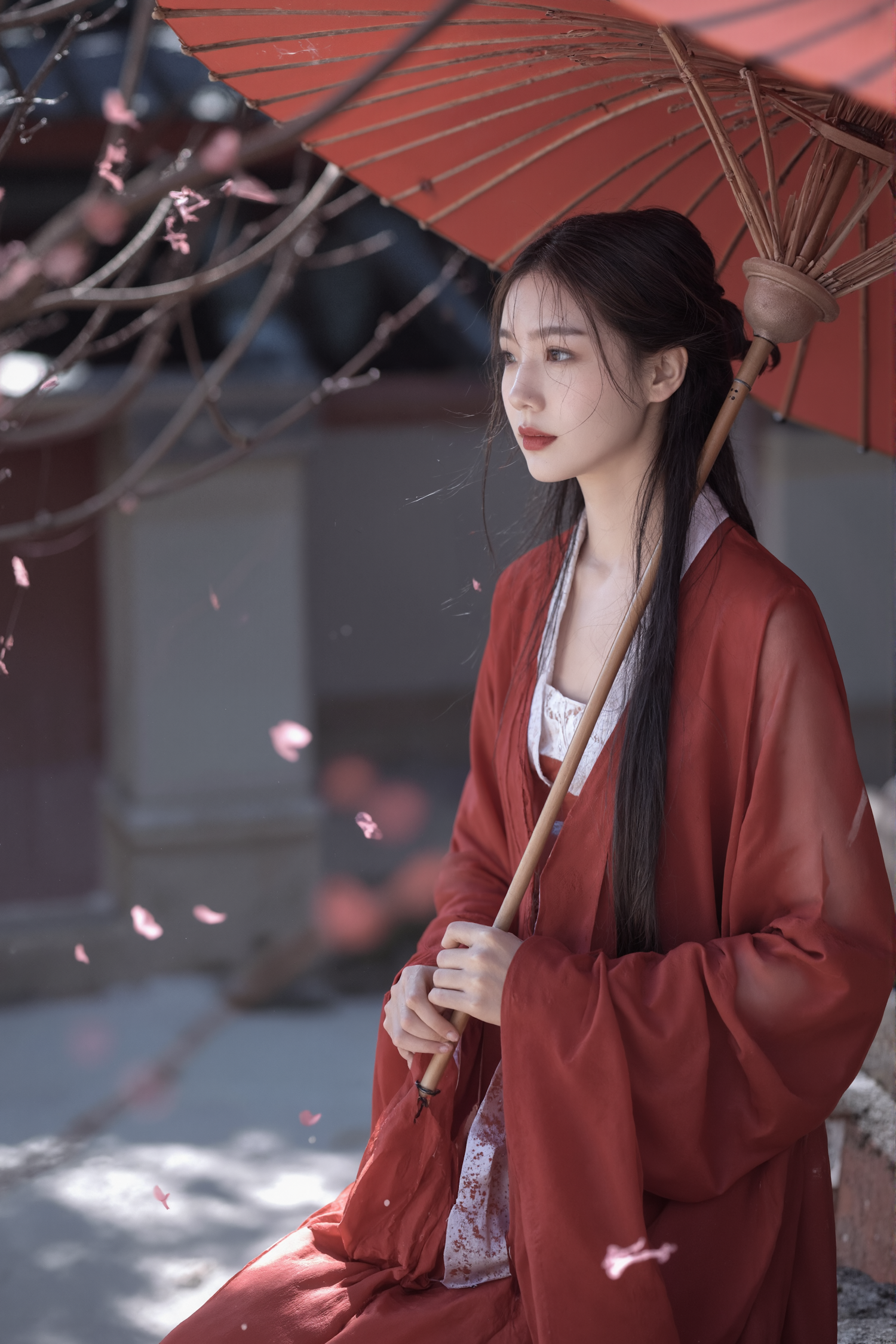 A serene portrait of a woman in traditional red attire holding a parasol, surrounded by floating petals in a tranquil setting.
