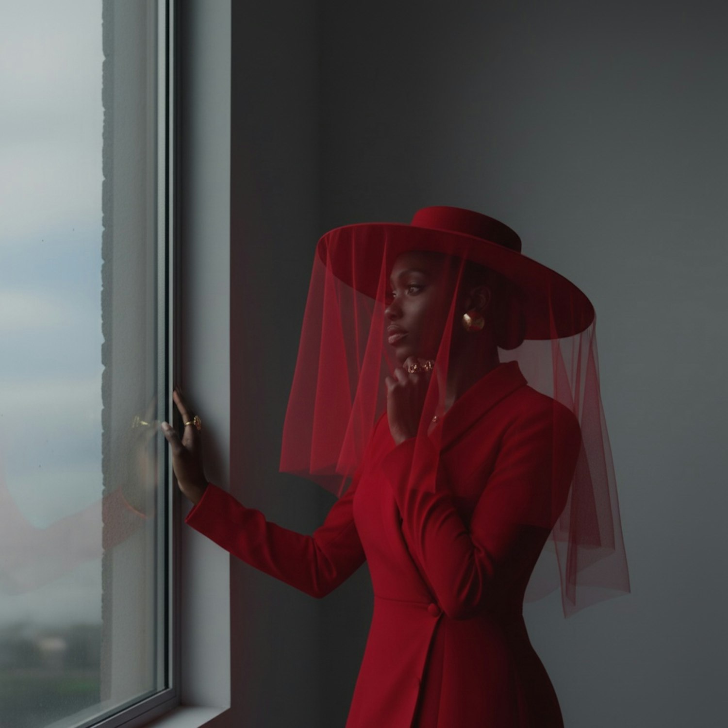 A woman in a red outfit with a veiled hat gazes out a window, creating a serene and elegant scene with soft lighting and minimal background.
