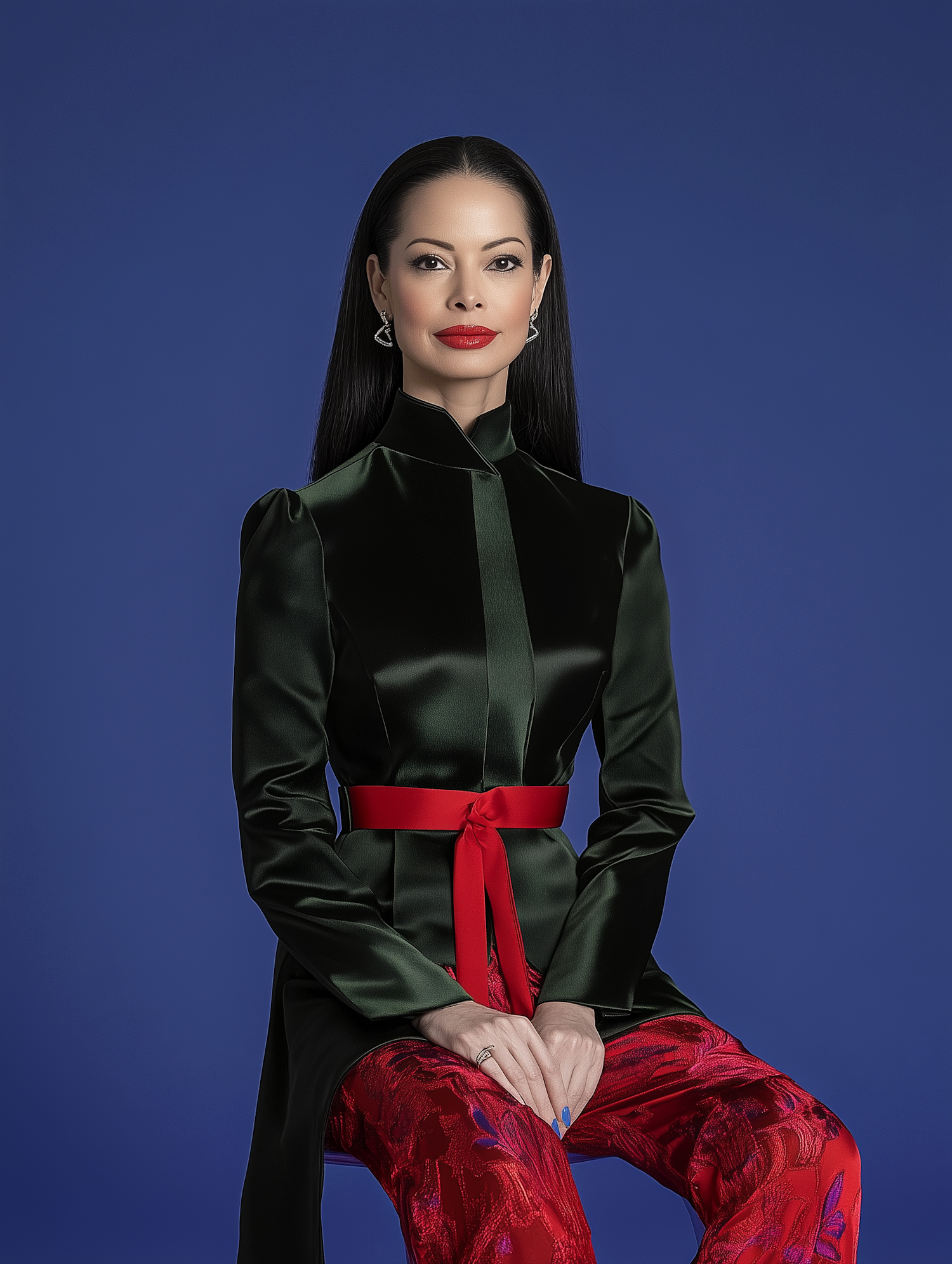 Elegant woman in green satin dress with red accents, sitting against a blue background. Bold red lipstick and intricate patterned pants.